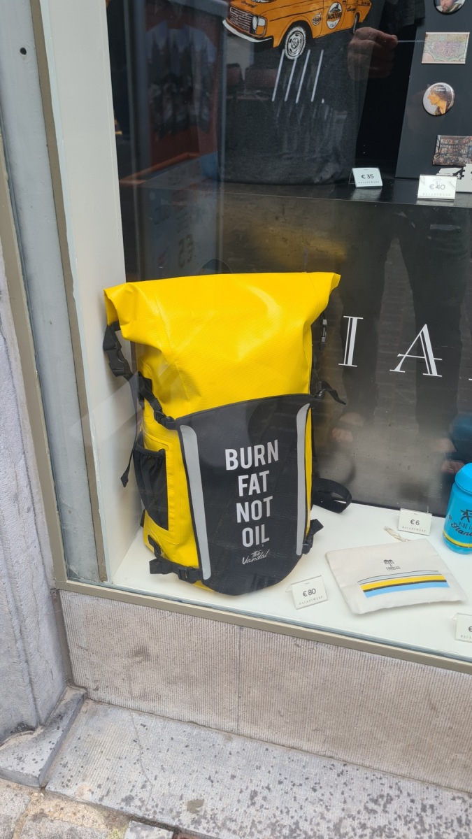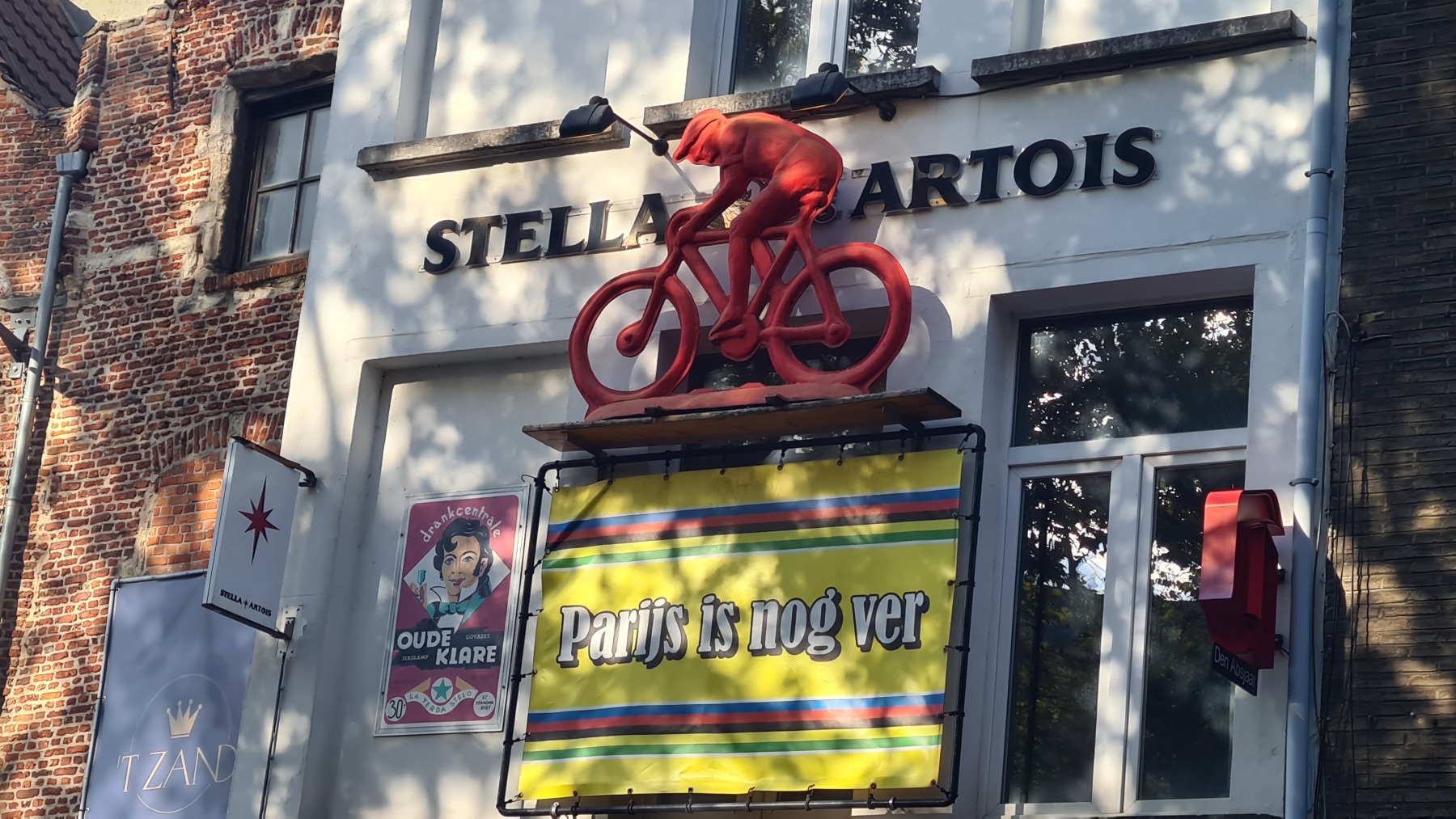 « Parijs is nog veg » (« Paris est encore loin ») peut on lire sous un coureur cycliste en enseigne d’un bar. Pourtant nous sommes à moins de 500 km de Paris même en suivant Eurovelo 5 de Bruxelles à Namur et Eurovelo 3 de Namur à Paris qui sont loin d’être le plus court chemin !