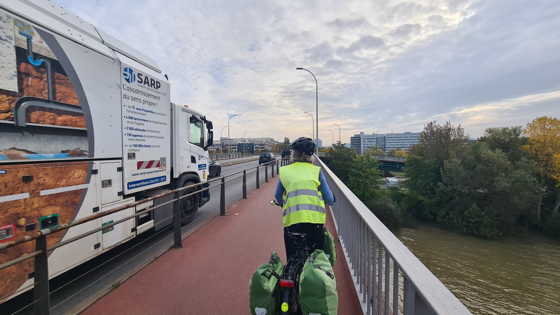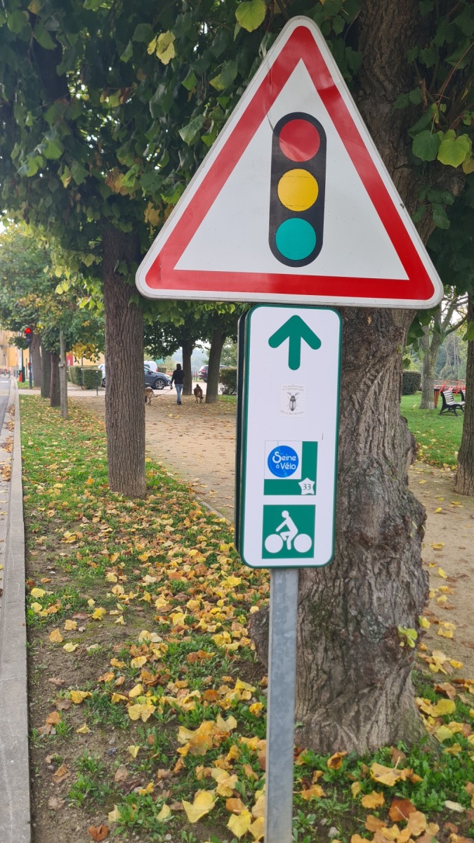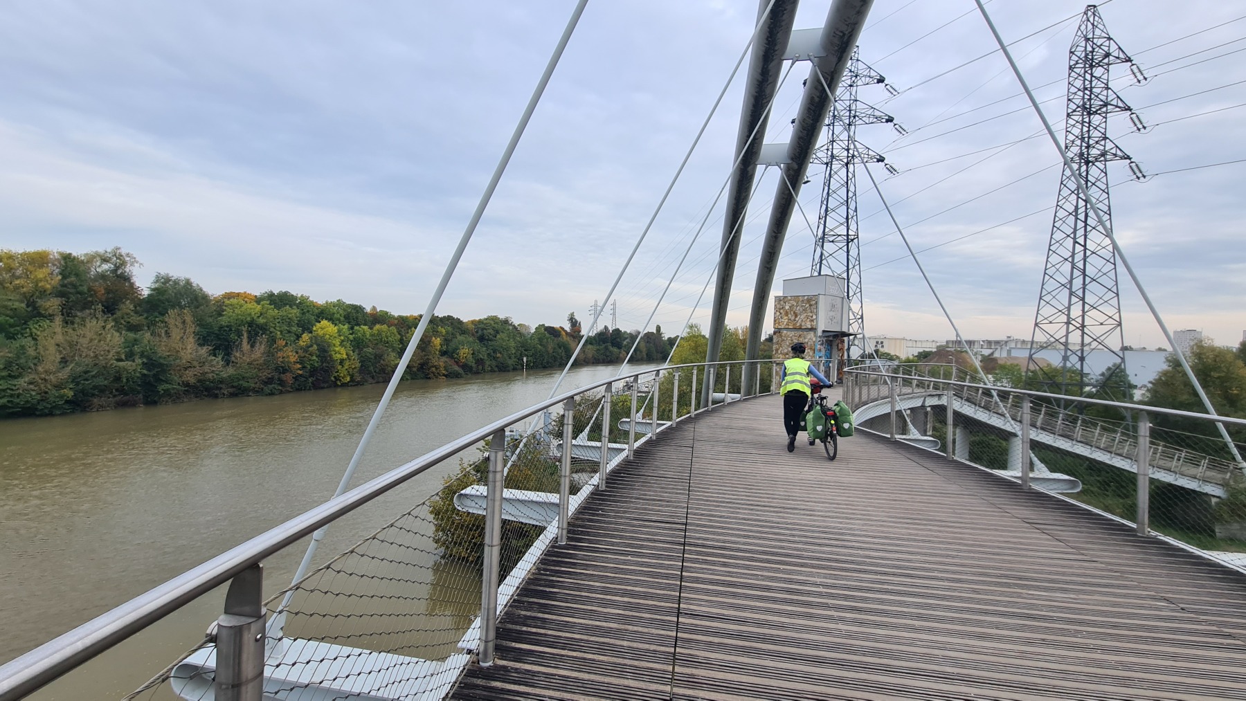 Nous avons quitté Marie-Laure, Gabriel et Étienne pour reprendre notre périple et nous avons rejoint la Seine à vélo à Herblay. Nous avions un assez mauvais souvenir de la Seine à vélo pour l’avoir suivie l’année dernière entre Lillebonne et le Havre où l’itinéraire qui suit une nationale empruntée par des camions sans aucun aménagement spécifique nous avait semblé suicidaire. Ce n’est pas le cas de la section que nous avons emprunté ce matin qui était très agréable.