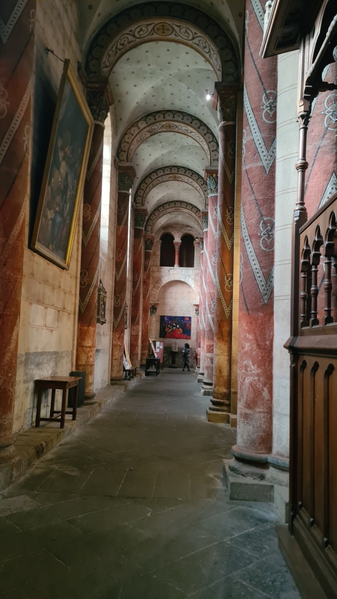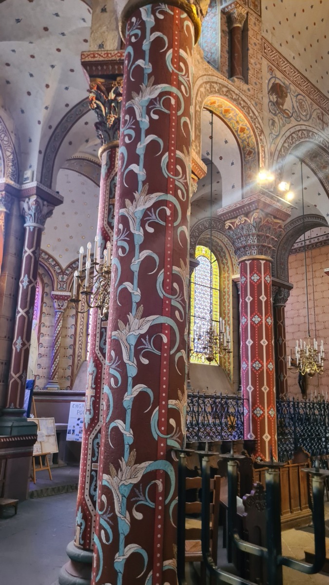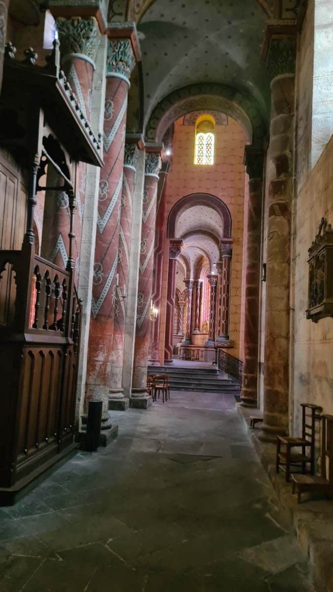 D’après Wikipédia, « les restaurations du XIXe siècle ont rendu à l’église sa polychromie intérieure (entre 1857 et 1859) ». Les épis de maïs que l’on voit sur un des piliers font douter de la fidélité de cette restitution en ce qui concerne les motifs 😉 … espérons que les coloris soient plus fidèles !