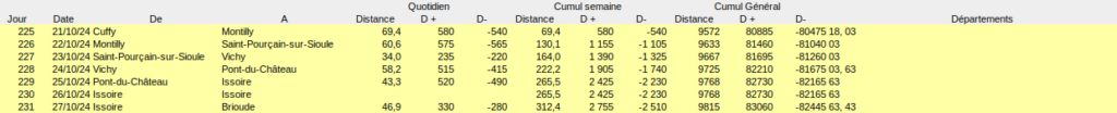 Un jour de repos à Issoire (en vert) et six jours de vélos sur la Via Allier.