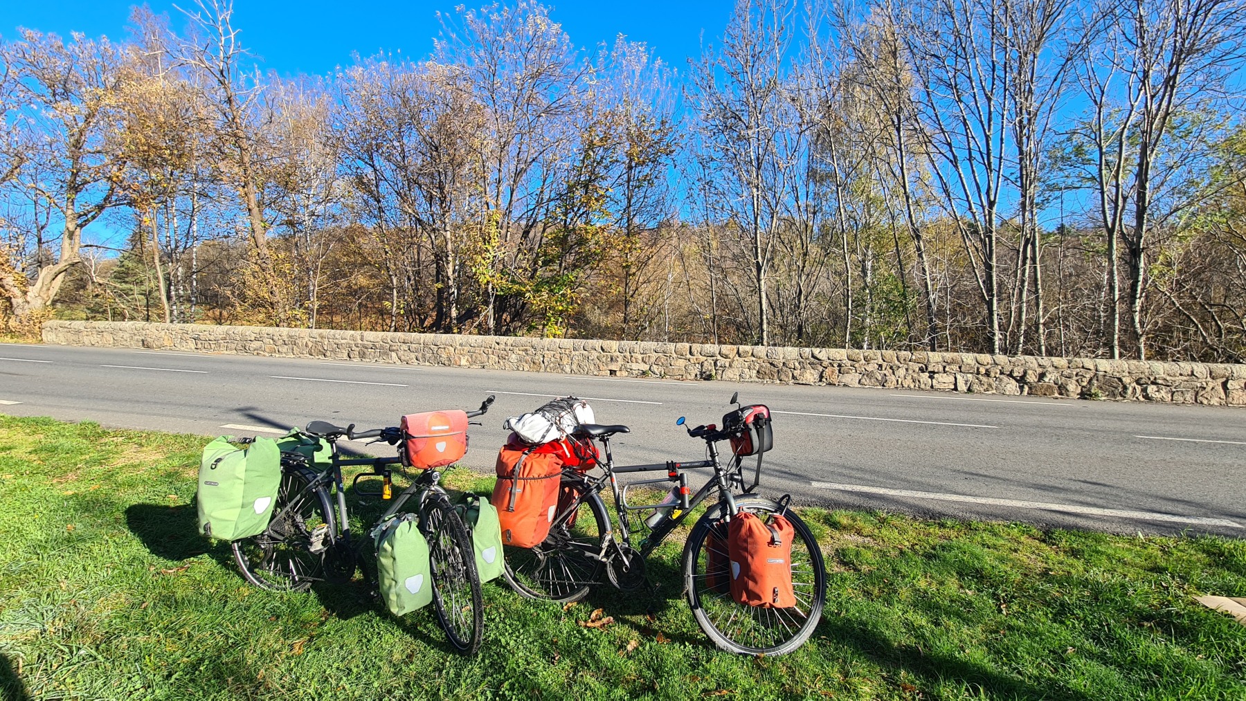 Hier soir nous en étions à 9998 km depuis notre départ le 11 mars. Ce matin, après avoir parcouru 2 km nous avons pris des photos des vélos et des cyclistes pour fêter les 10 000 km. Peu après nous sommes arrivés au dessus des gorges de l’Altier et du lac de Villefort.