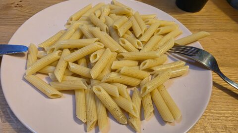 Hier soir nous n’avons pas voulu retourner au village pour faire des courses et nous avons apprécié les pâtes mises à disposition dans notre gite. Et comme nous n’avions pas voulu vider le paquet et que nous avions encore faim nous avons complété par de la semoule de couscous.