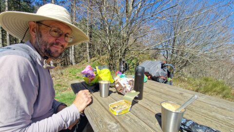 Au moment de déjeuner je me suis rendu compte que j’avais oublié nos piqueniques dans le réfrigérateur du gîte. Adieux donc magret séché, pommes de terres au thym et les deux tupperwares légers qui sont notre seule vaisselle.
