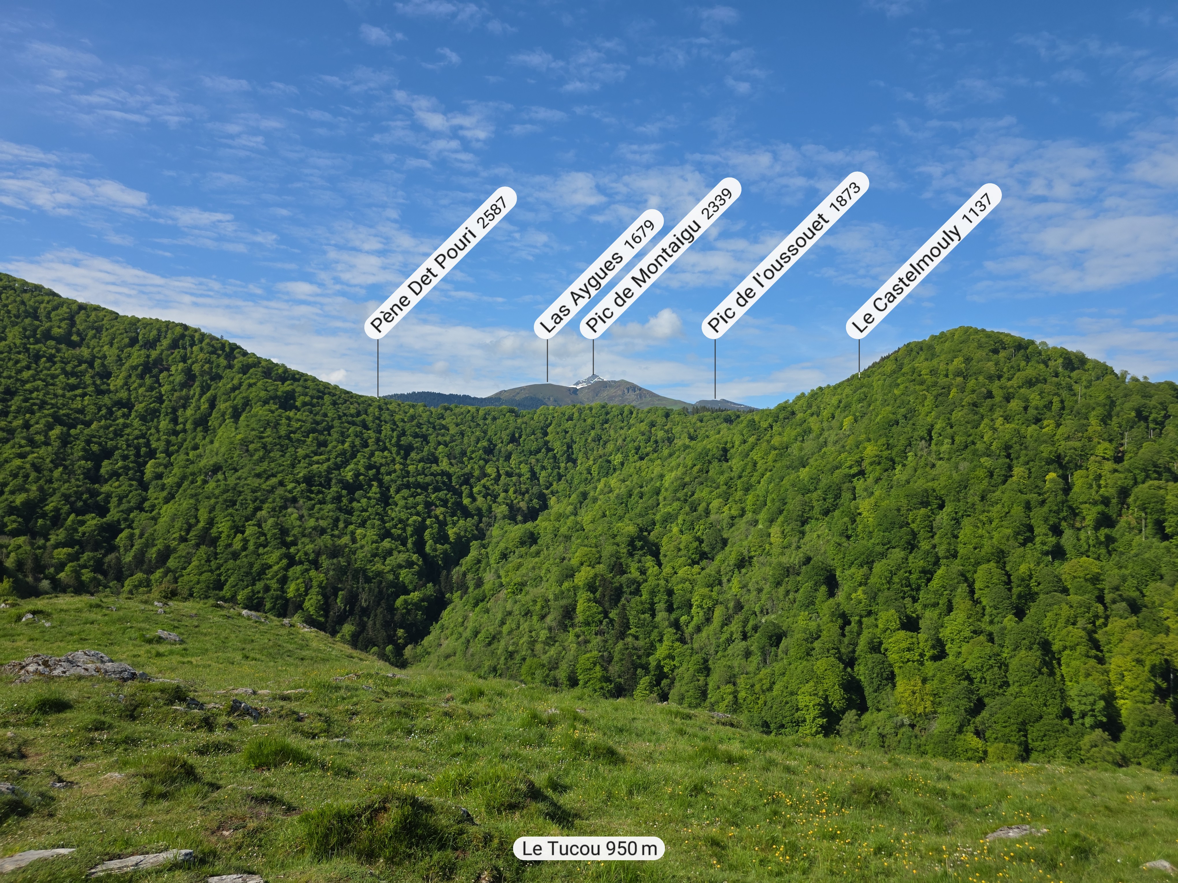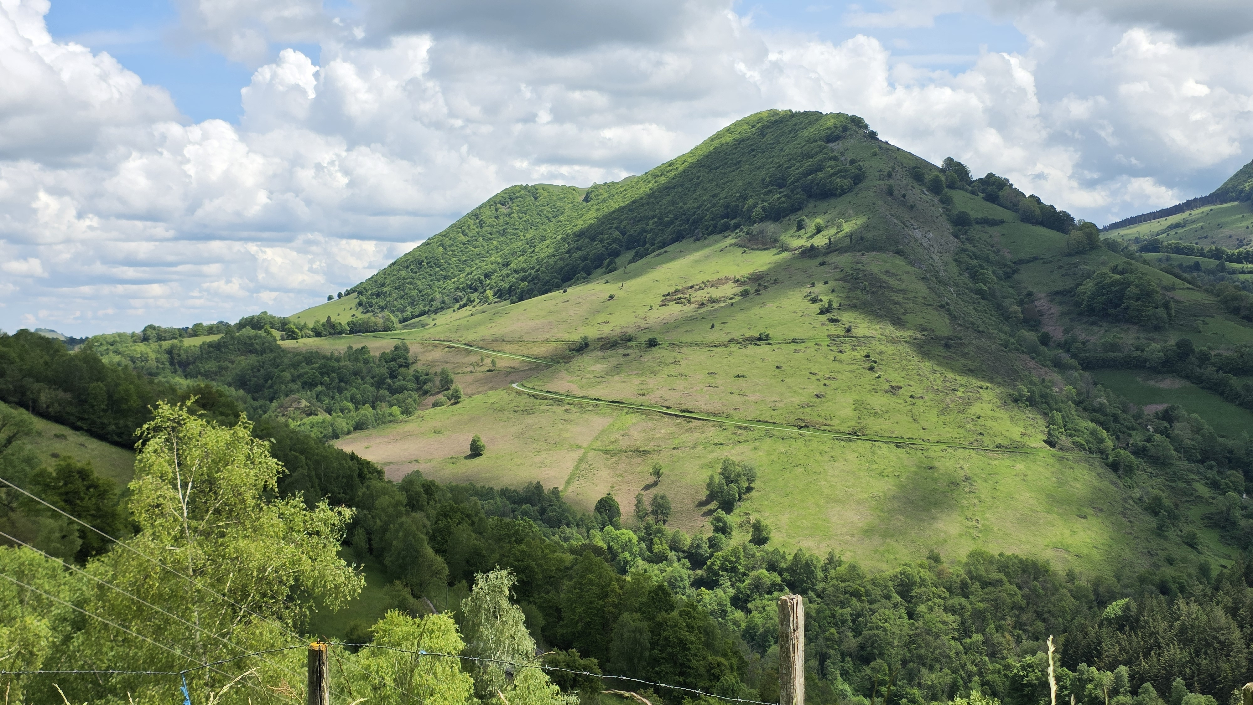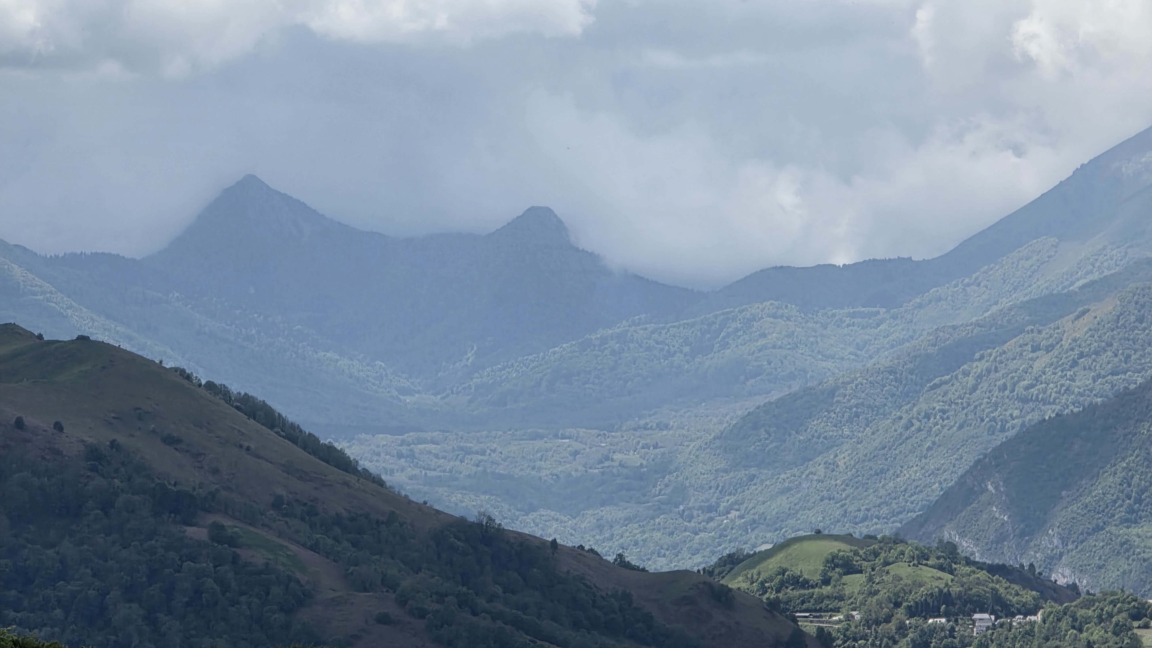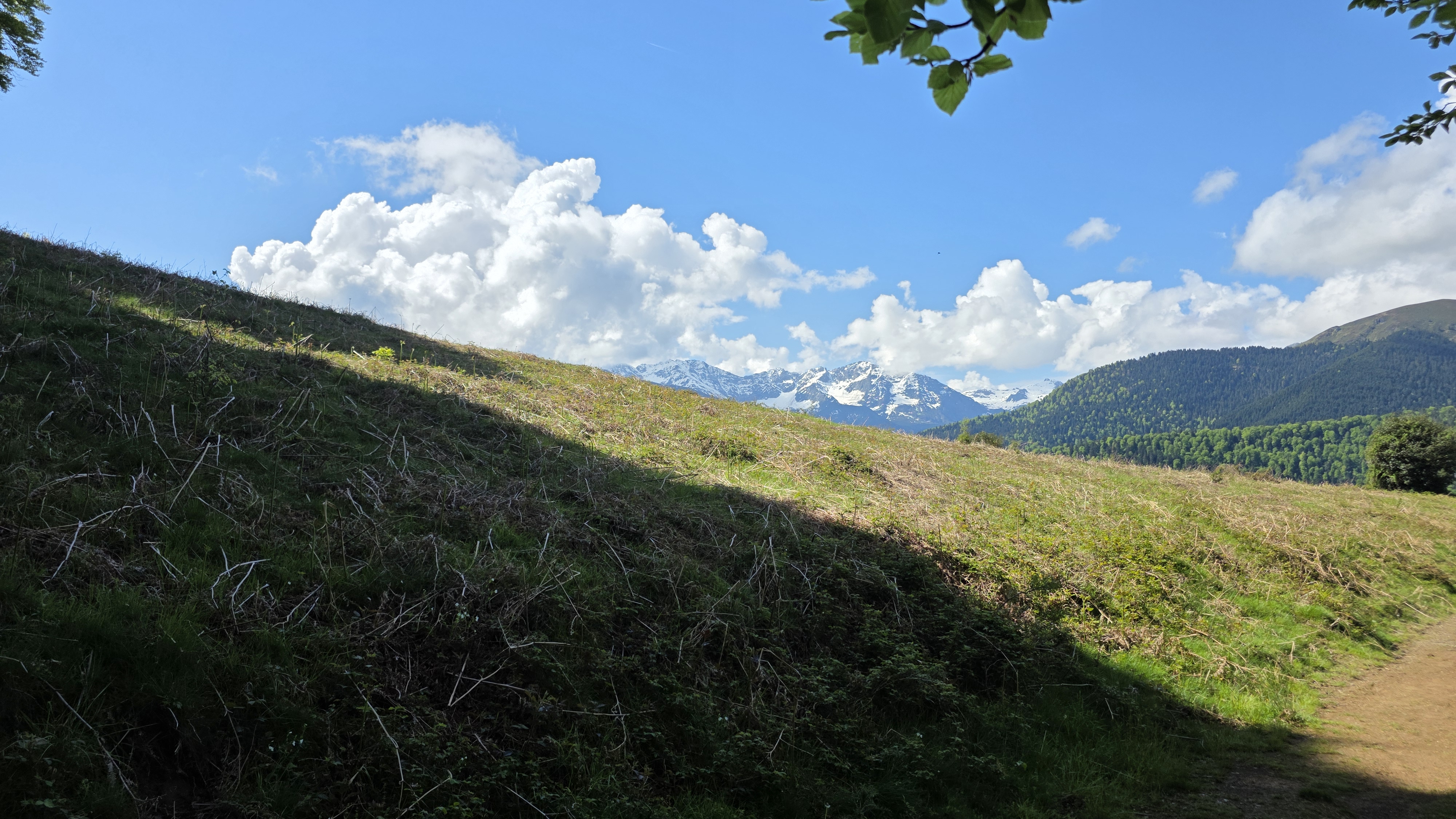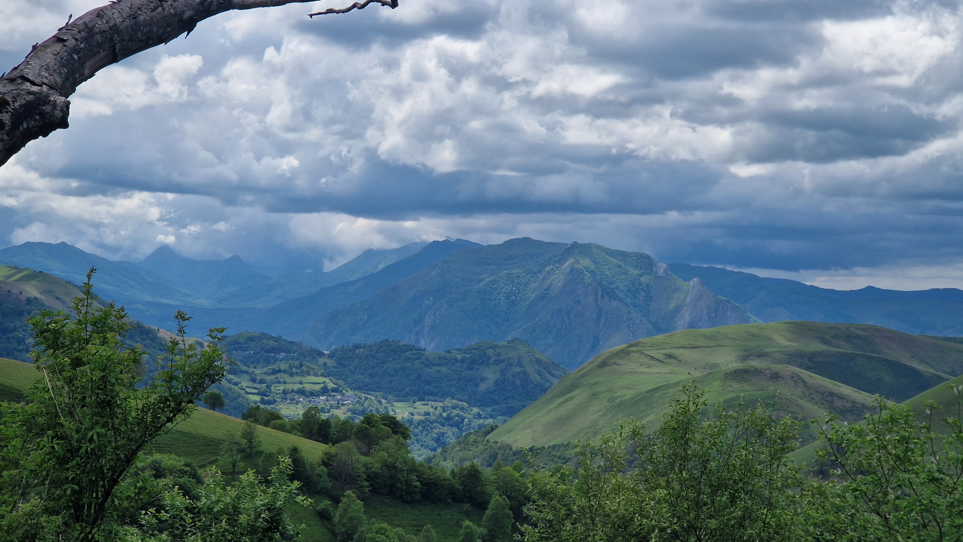 Après un nouveau passage en forêt nous avons atteint une crête débonnaire et rencontré notre premier troupeau de moutons en liberté et une vue sur le massif du Pic du Midi de Bigorre dont le sommet est resté masqué par les nuages.