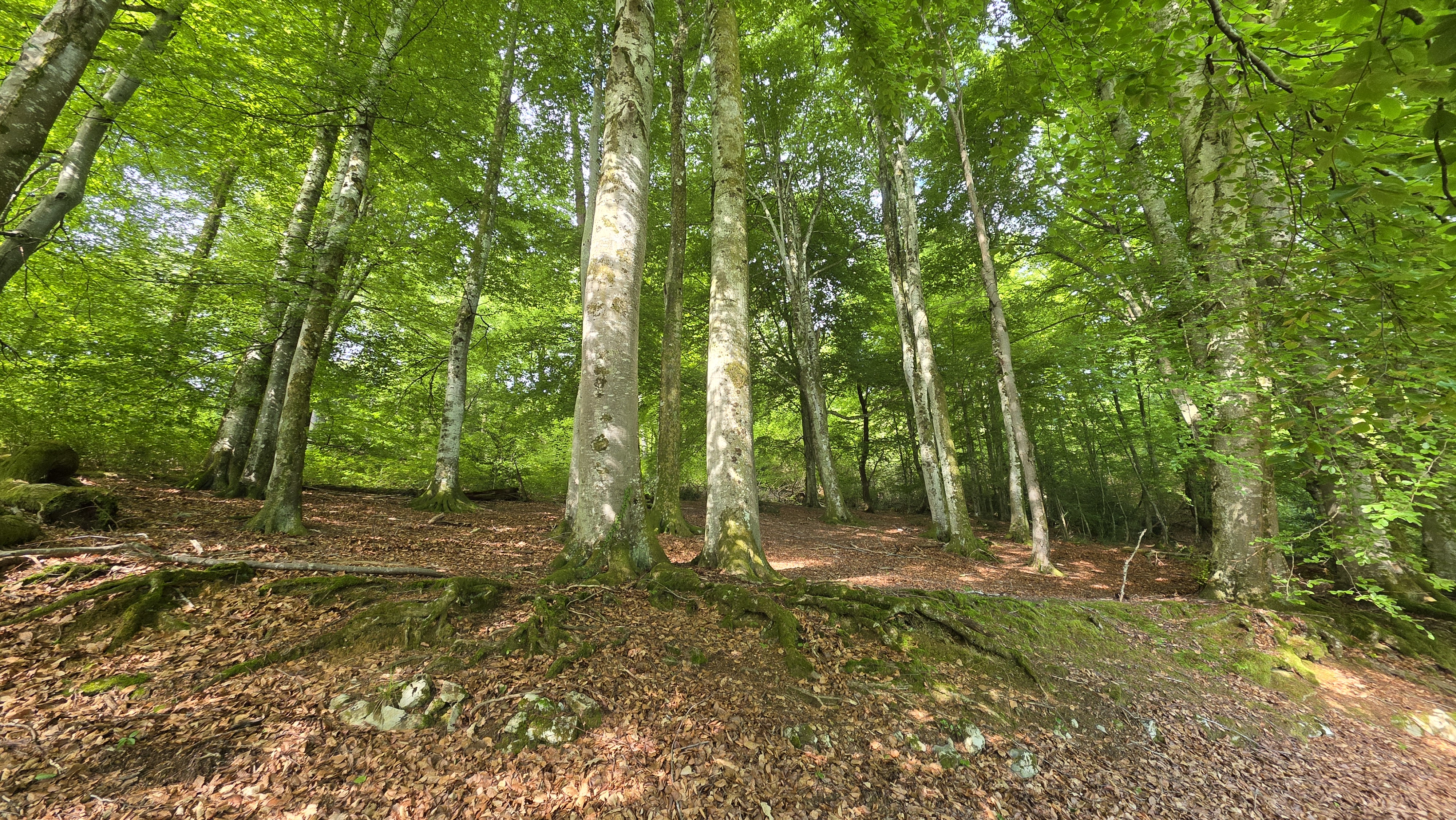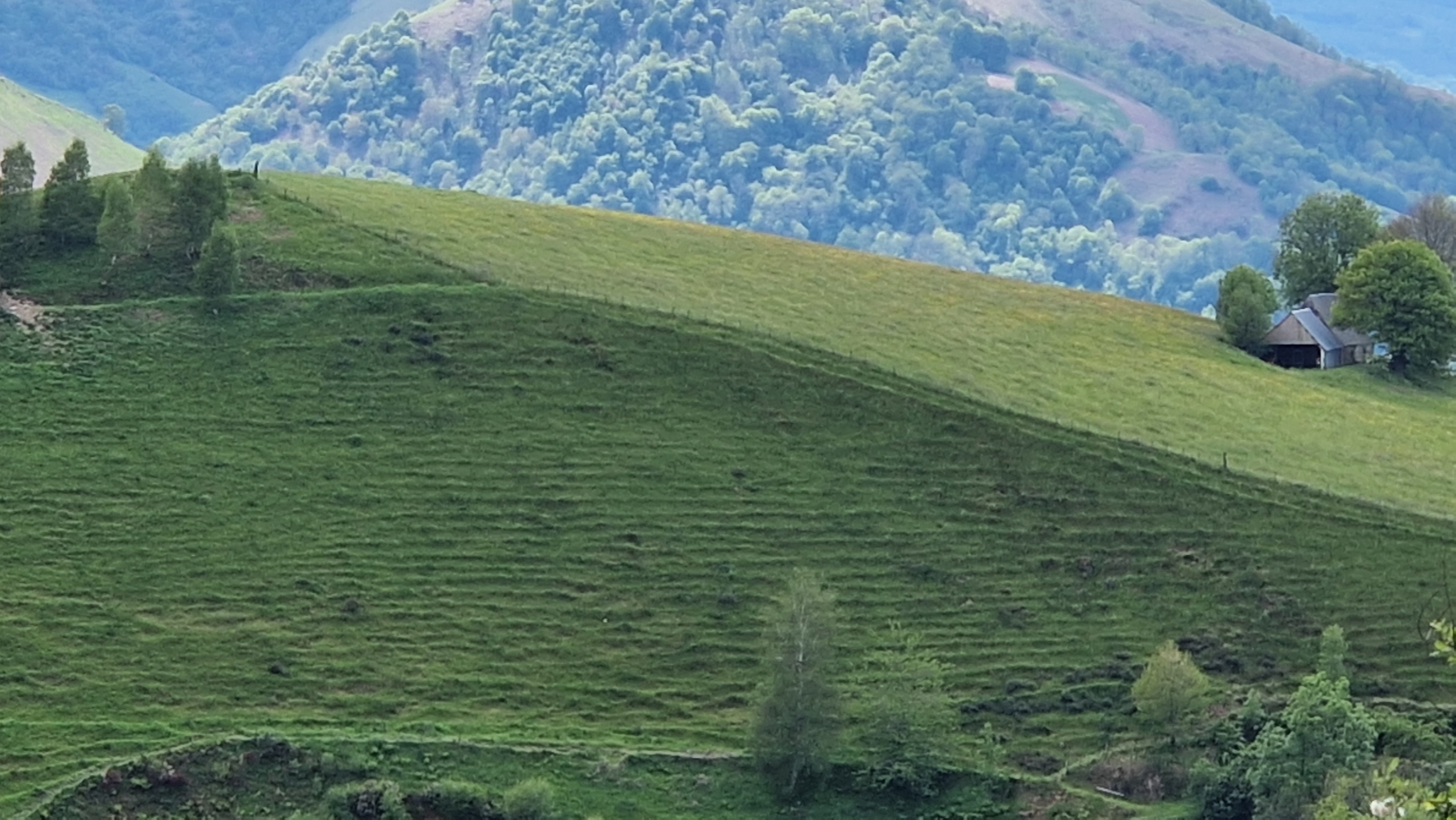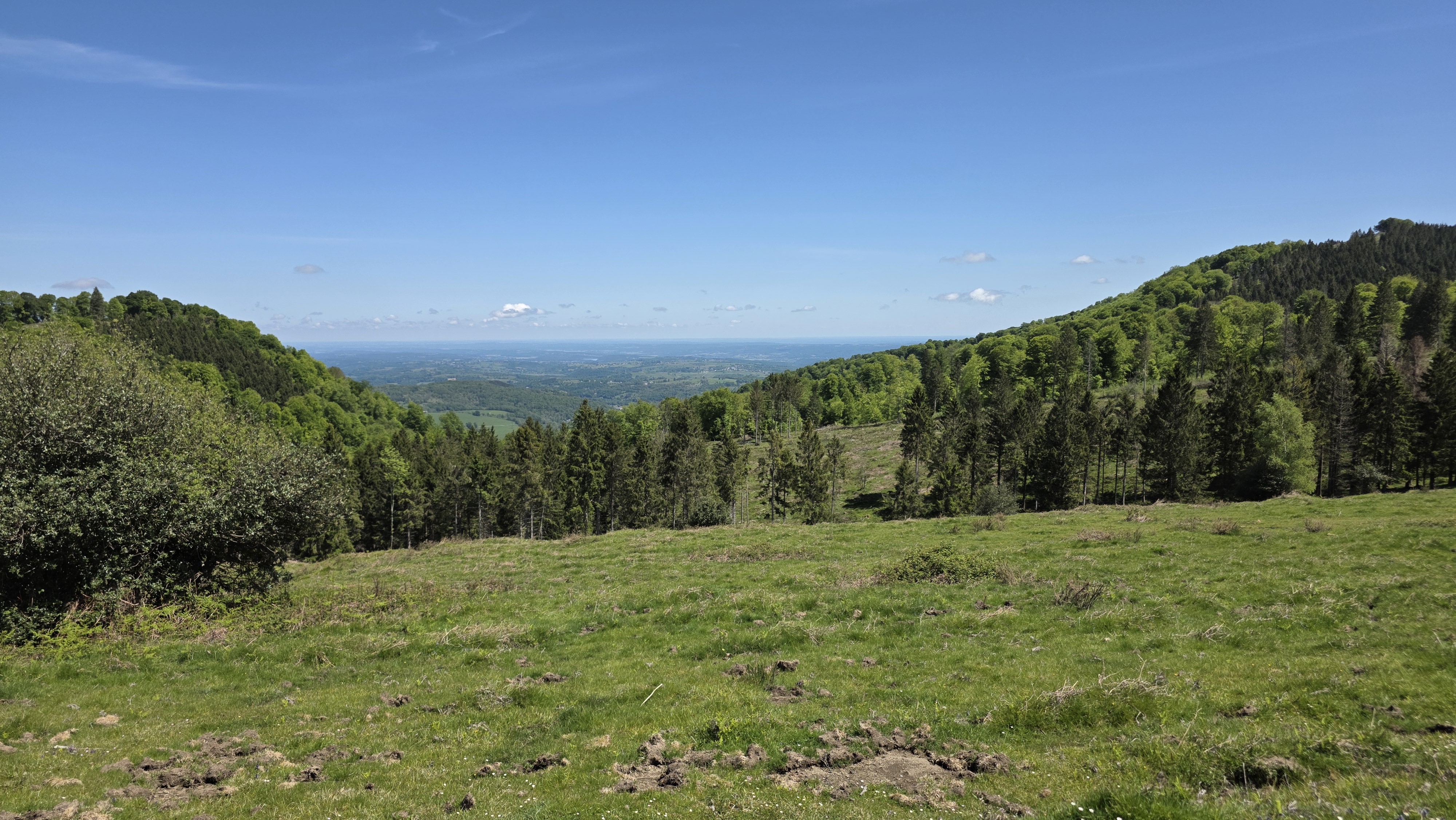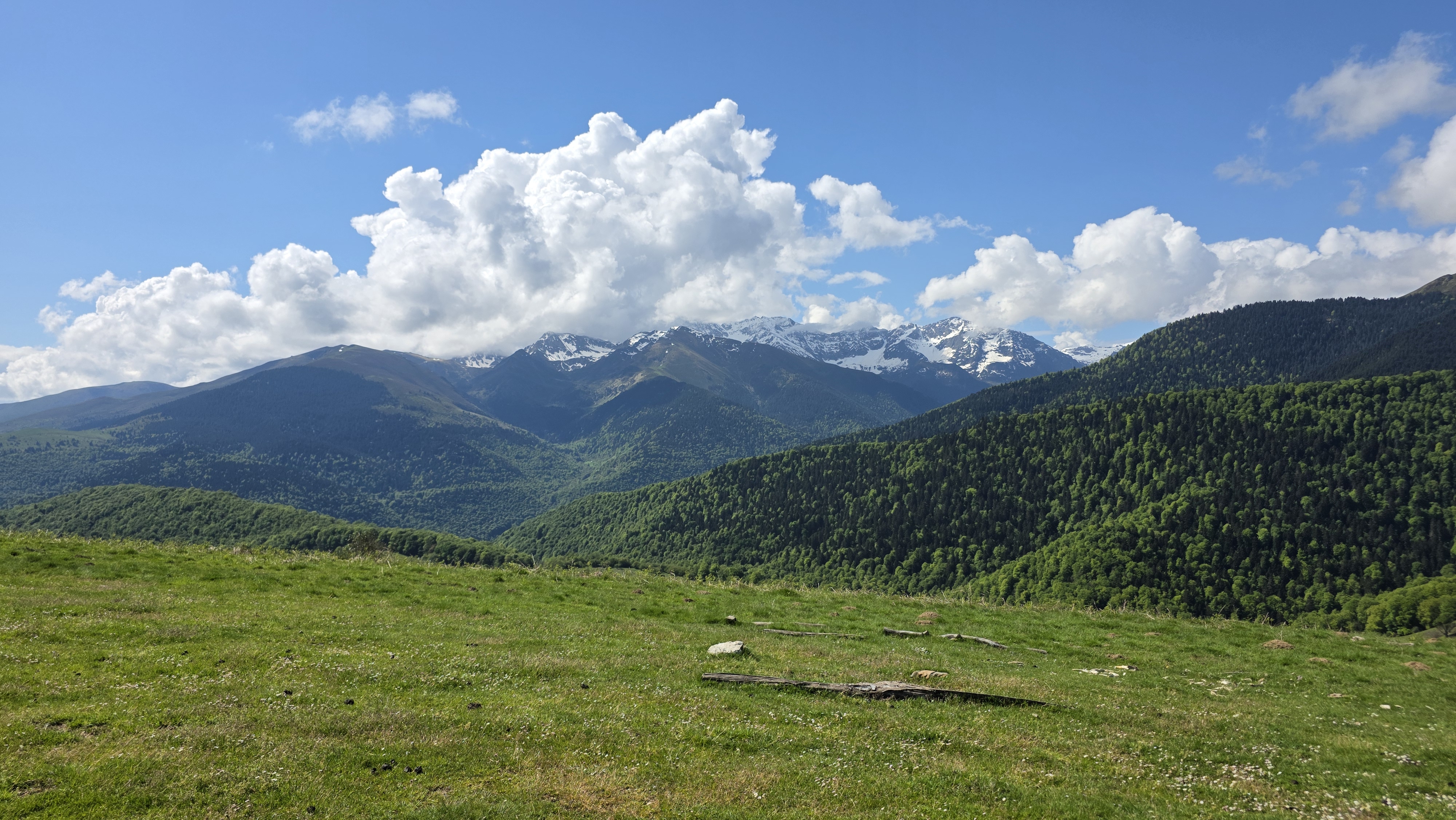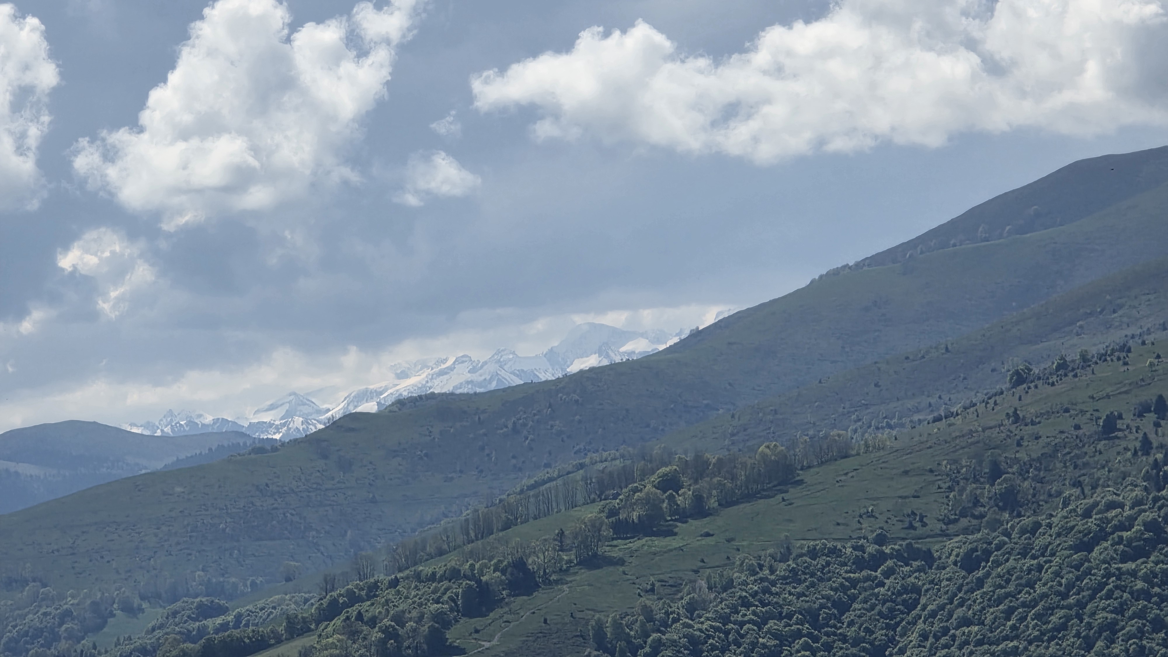 Après un nouveau passage en forêt nous avons atteint une crête débonnaire et rencontré notre premier troupeau de moutons en liberté et une vue sur le massif du Pic du Midi de Bigorre dont le sommet est resté masqué par les nuages.
