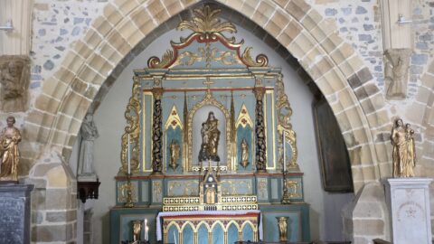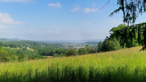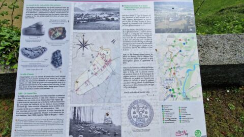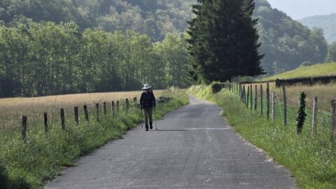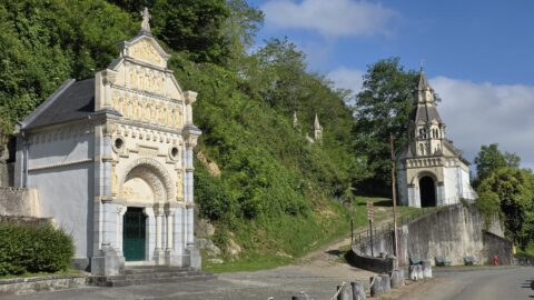 Le GR quitte le site, et la vallée du Gave de Pau, par le chemin de croix et pour cheminer dans les paysages vallonnés du Pays de Nay.