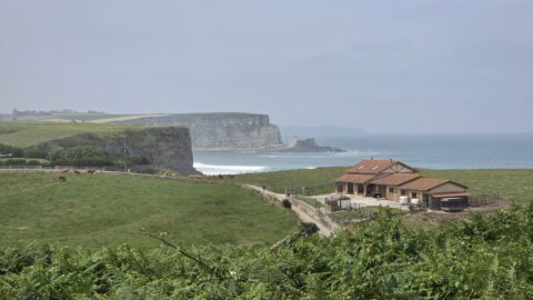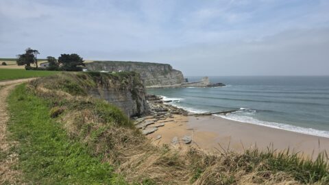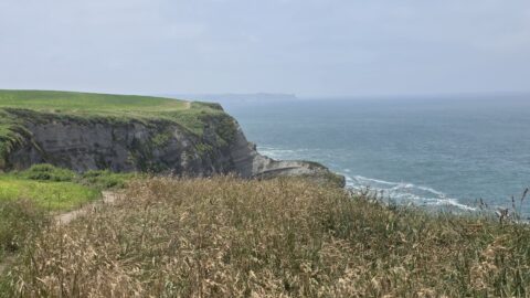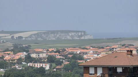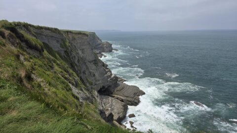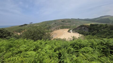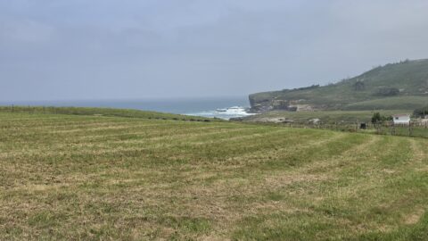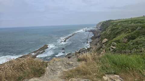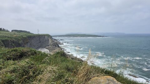 Le chemin se poursuit jusqu’à la côte que nous rejoignons au dessus de la plage de Galizano. Elle est bien différente de ce que nous avons vu depuis notre arrivée en Espagne et prend la forme d’un plateau vallonné creusé de « valleuses » qui se termine en falaise au dessus de la mer à la manière des falaises du nord de la France.