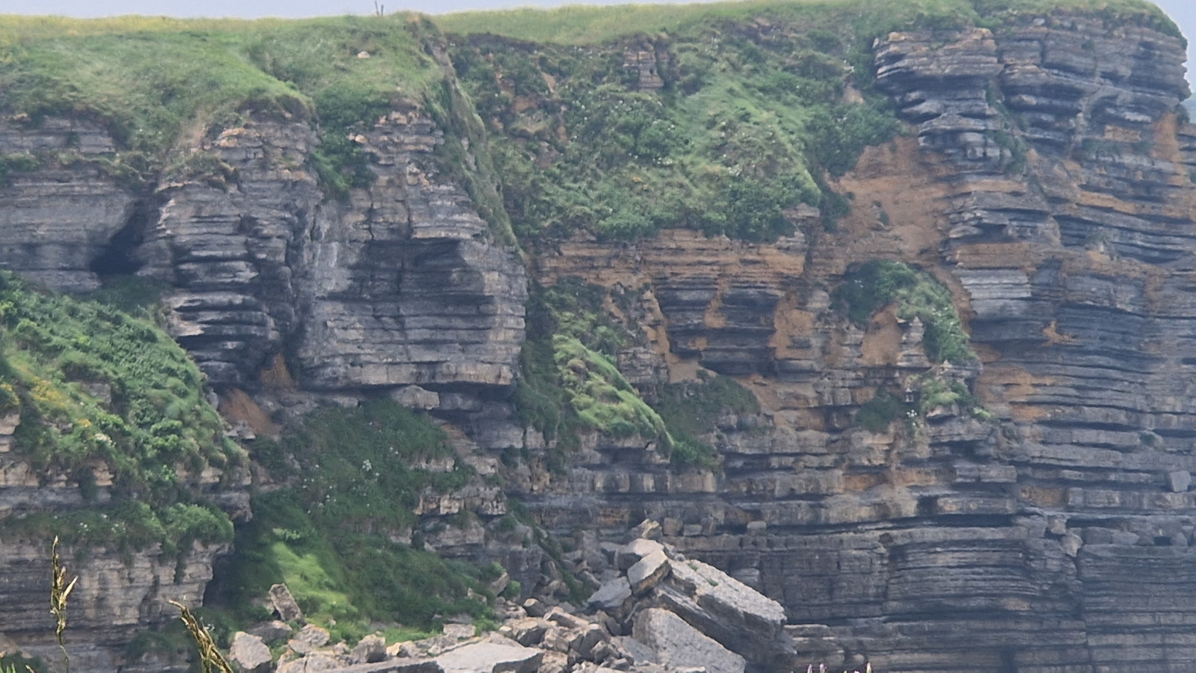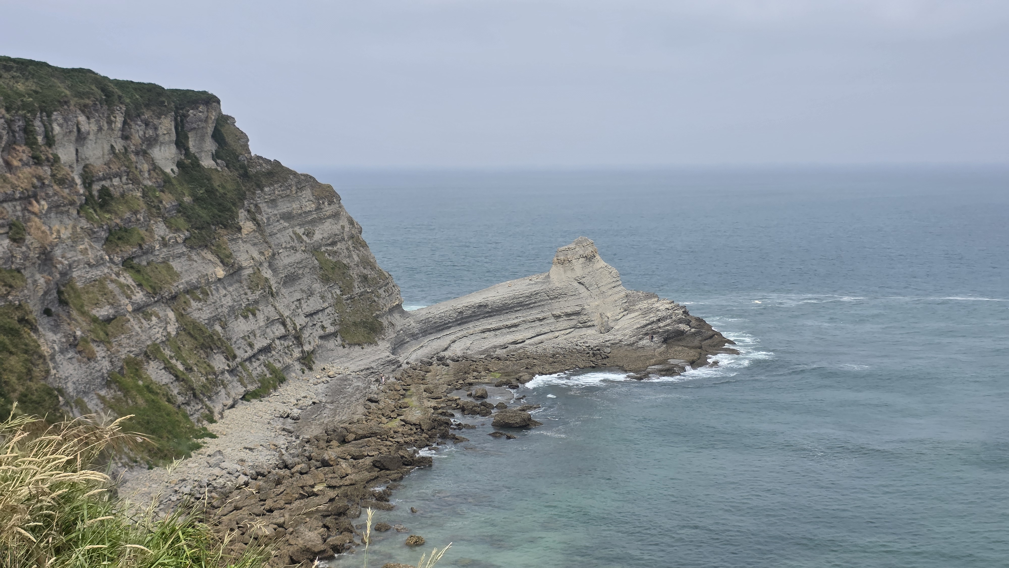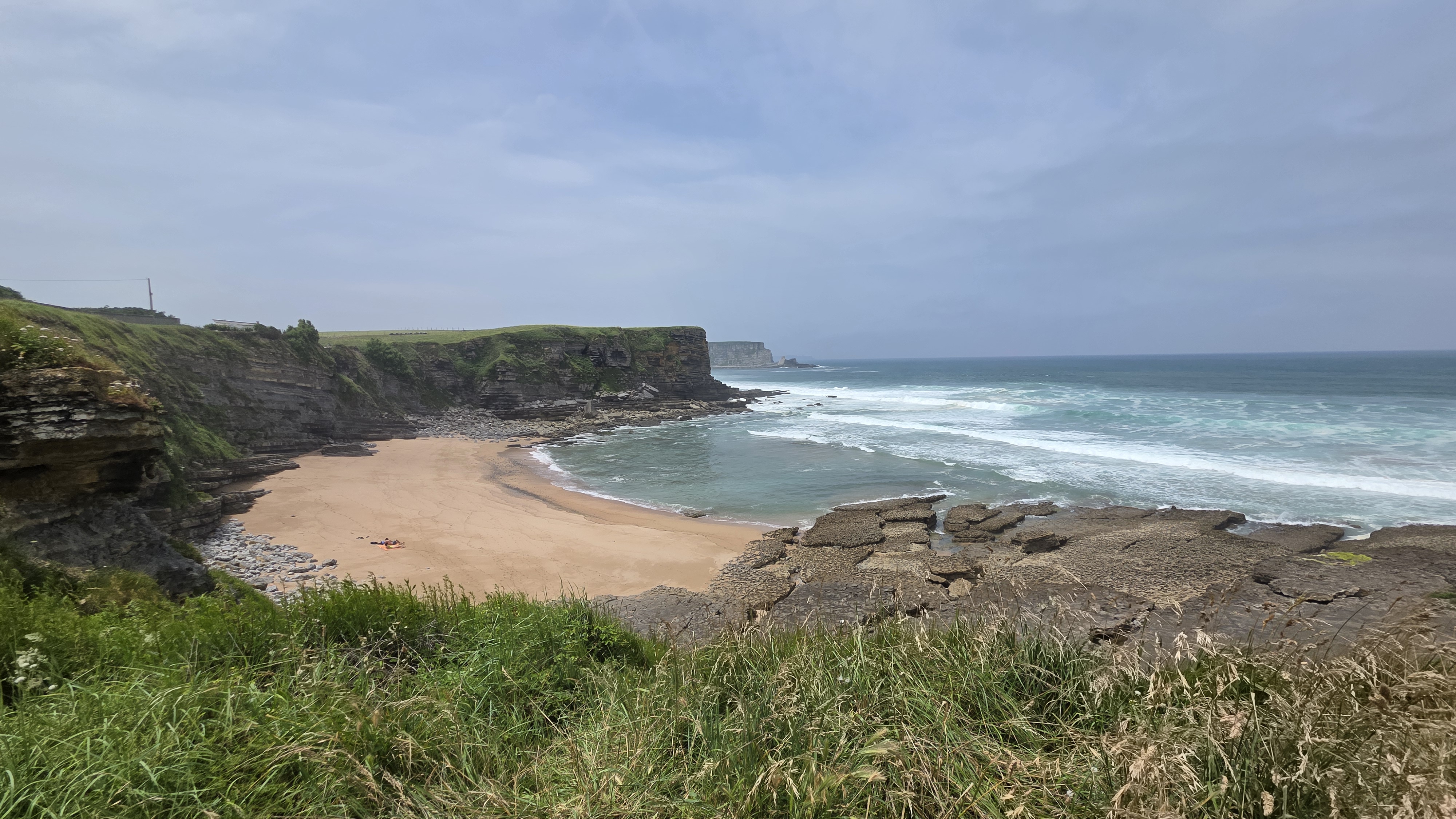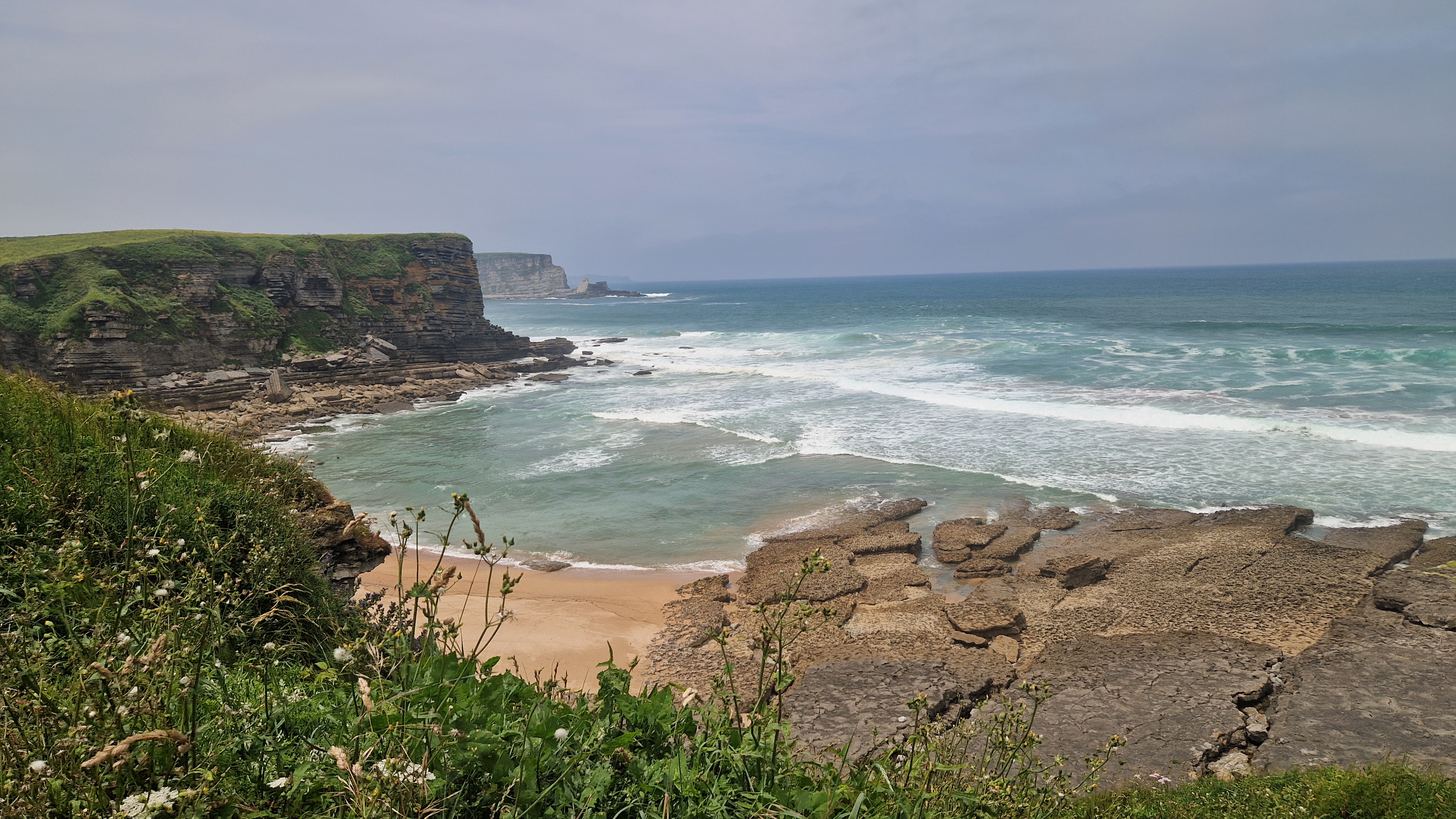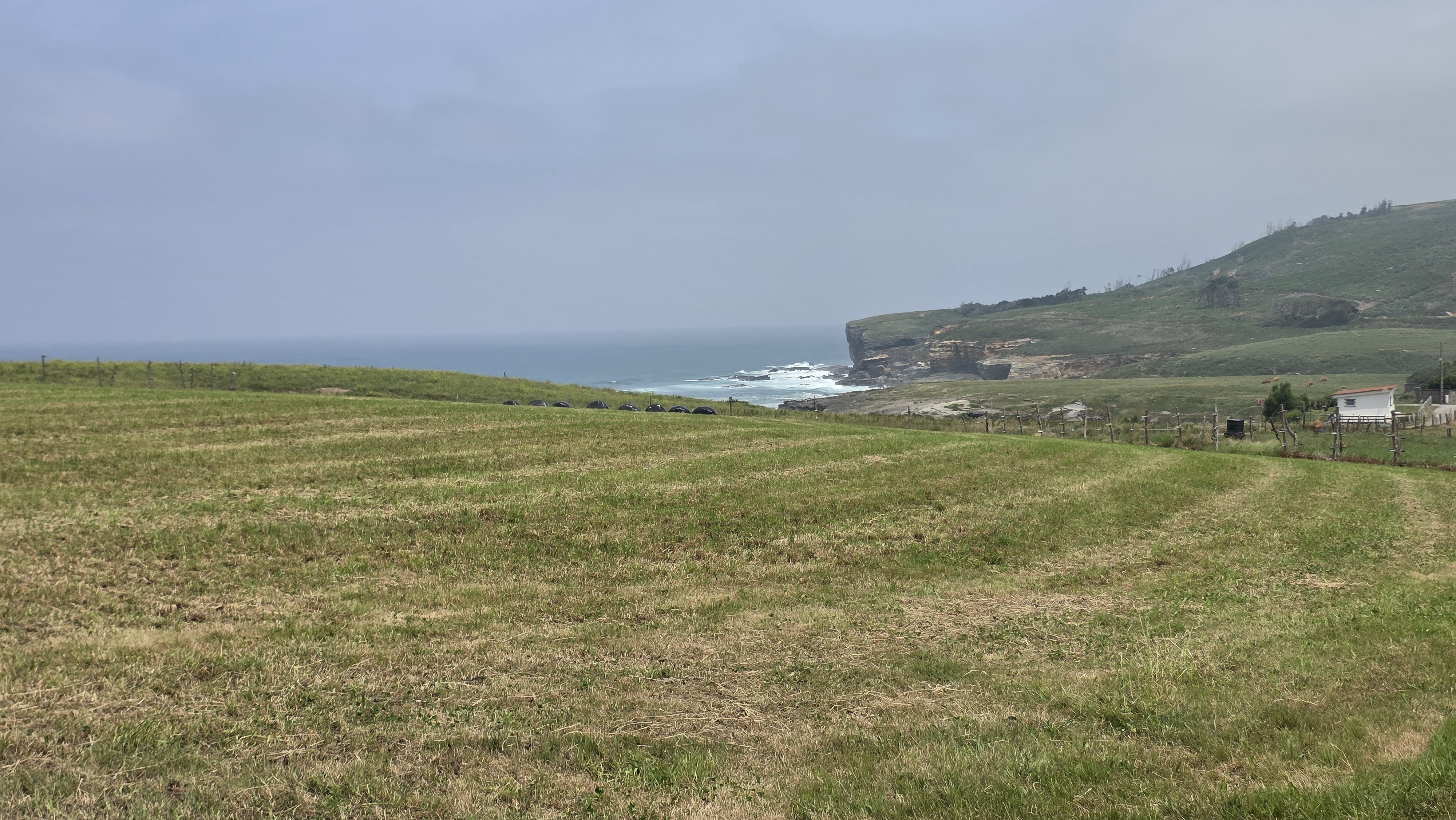 Le chemin se poursuit jusqu’à la côte que nous rejoignons au dessus de la plage de Galizano. Elle est bien différente de ce que nous avons vu depuis notre arrivée en Espagne et prend la forme d’un plateau vallonné creusé de « valleuses » qui se termine en falaise au dessus de la mer à la manière des falaises du nord de la France.