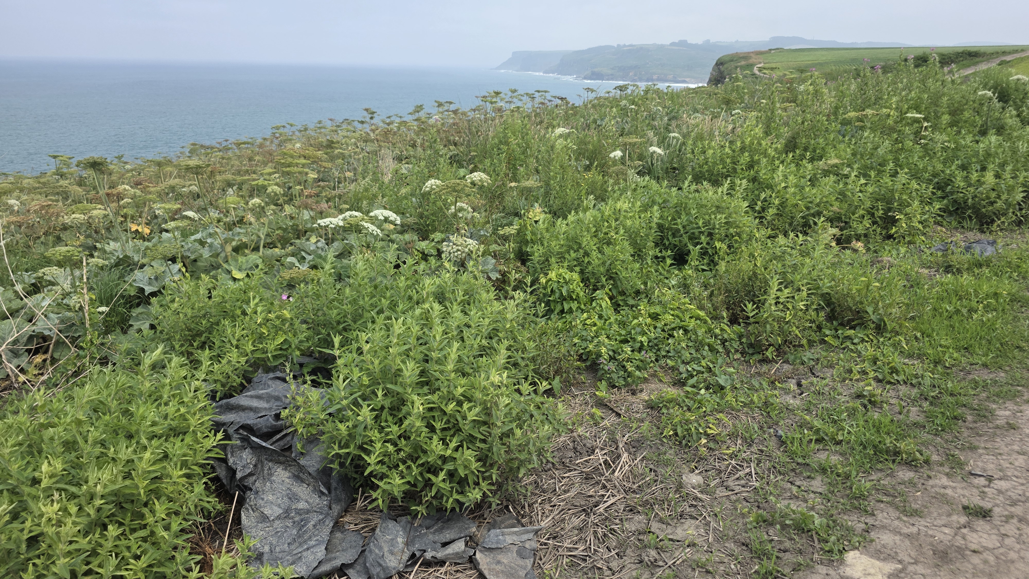 Le sentier et la vue sont superbes mais le plastique noir qui sert à enrubanner les balles d’ensilage est bien présent, à demi enterré sous le sentier ou dans les broussailles.