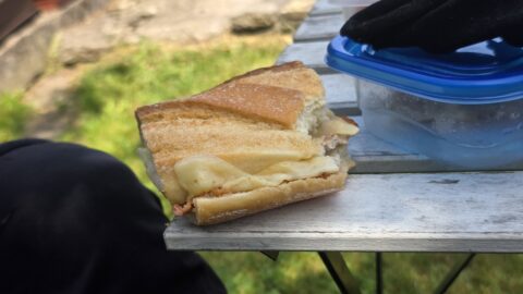 L’endroit n’est « pas un vrai bar » mais met à notre disposition des tables, des chaises, une petite cuisine et un distributeur automatique de produits de première nécessité qui a permis de compléter notre repas par un cappuccino frais et une tablette de chocolat.