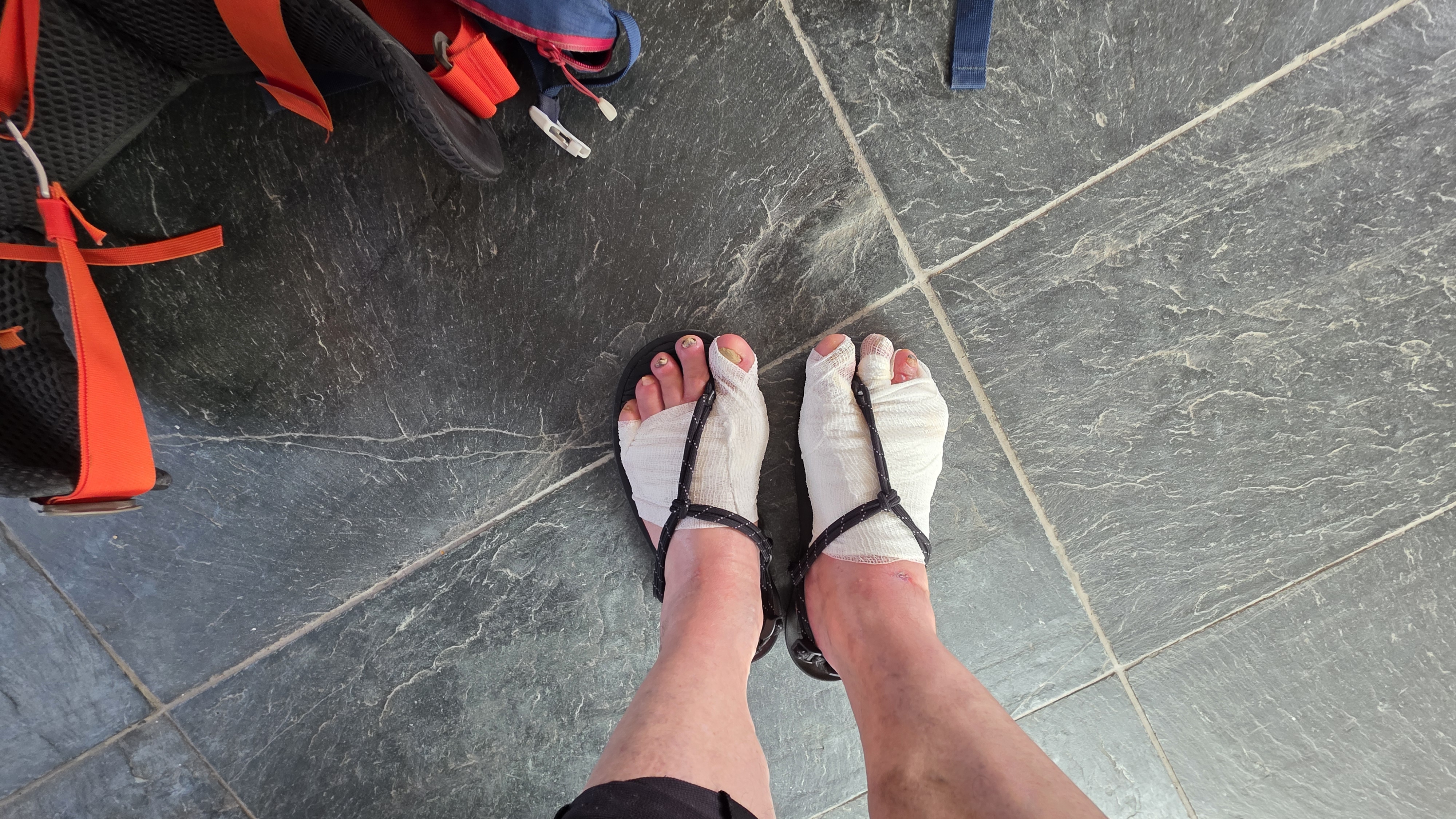 Hier j’ai eu très mal au pieds pendant toute l’étape et il devenait urgent d’aller consulter (je ne publie pas les photos de mes pieds, elles ressemblent à celles des paquets de cigarettes et je ne voudrais pas effrayer les enfants).