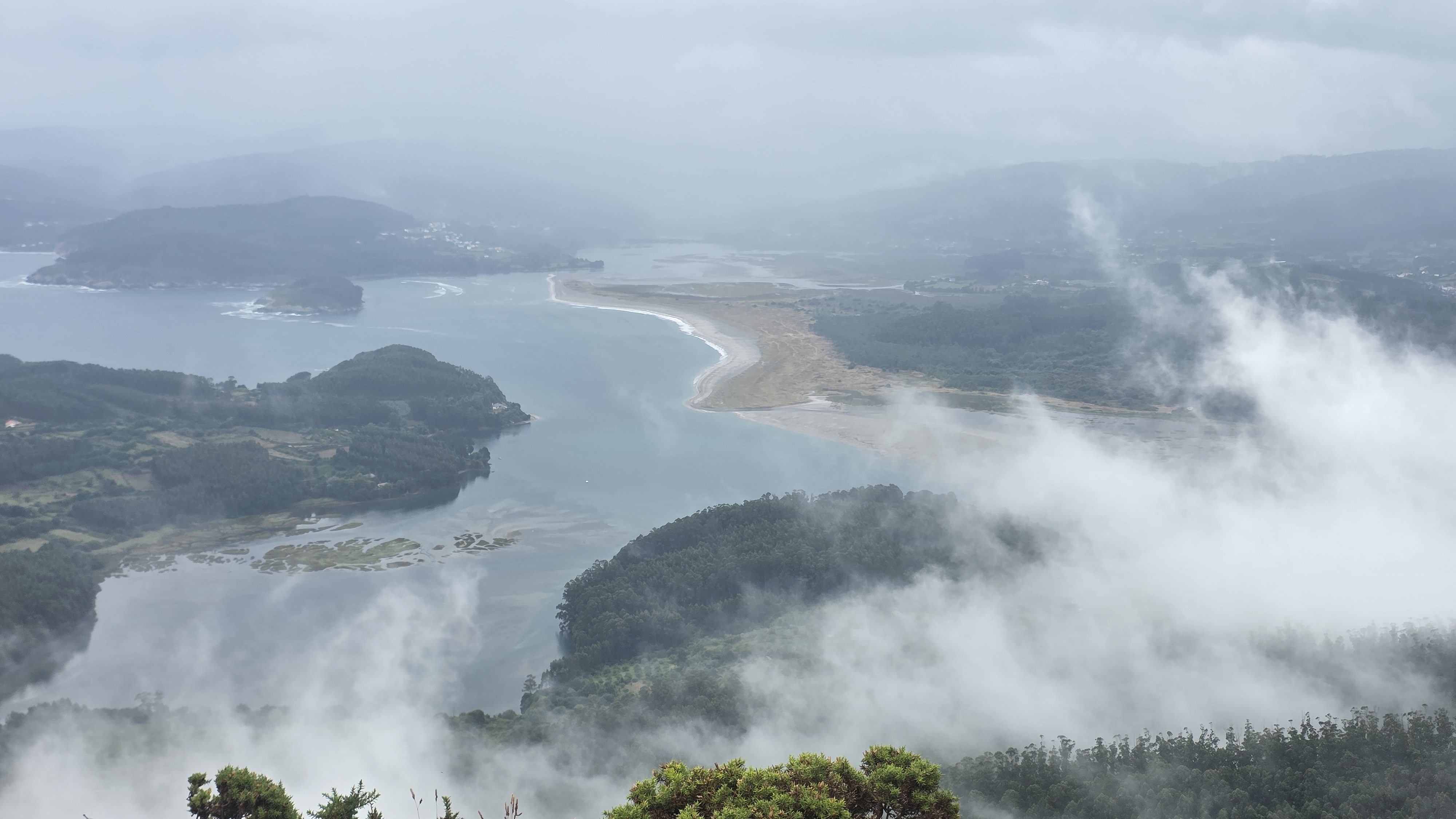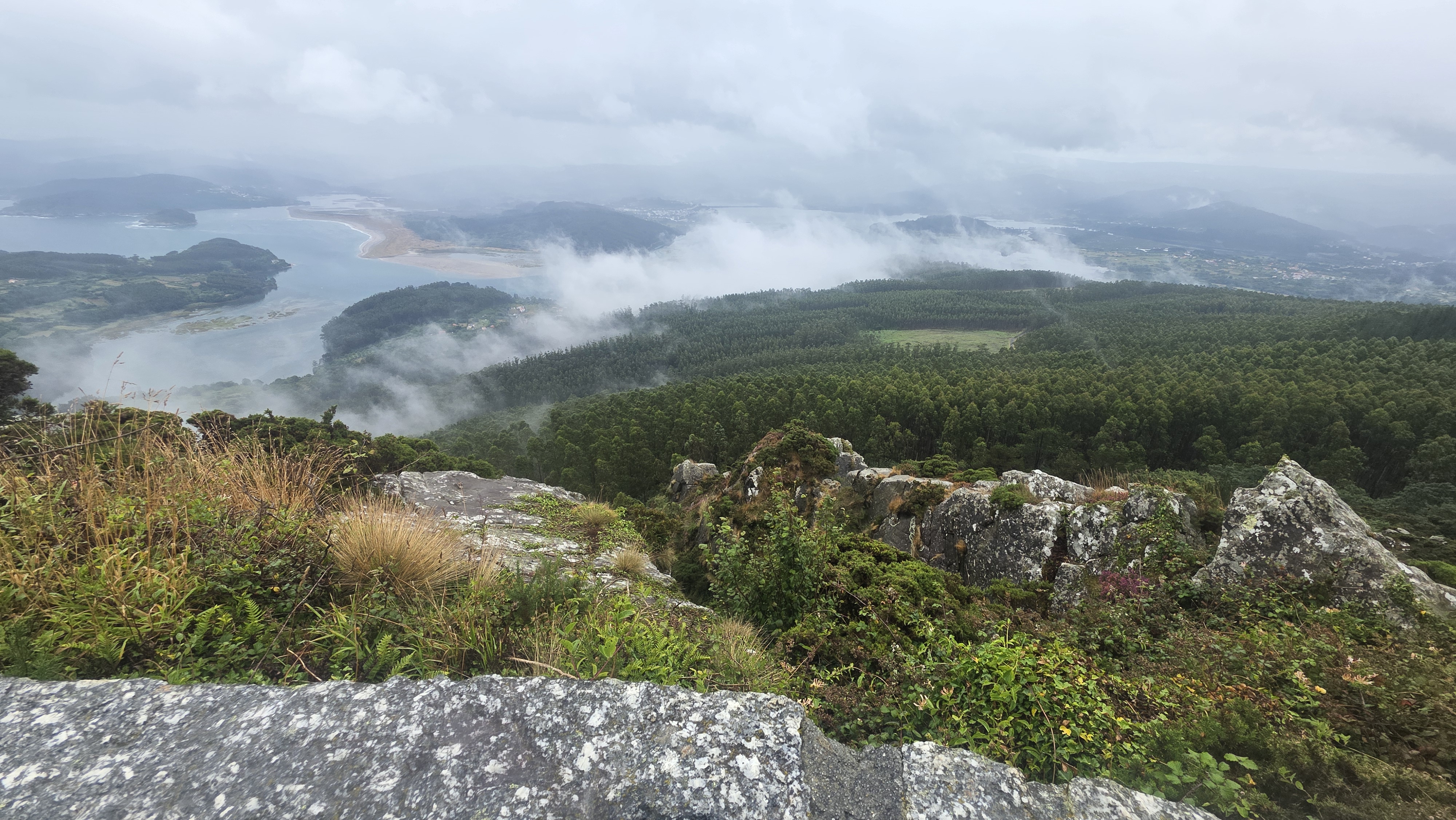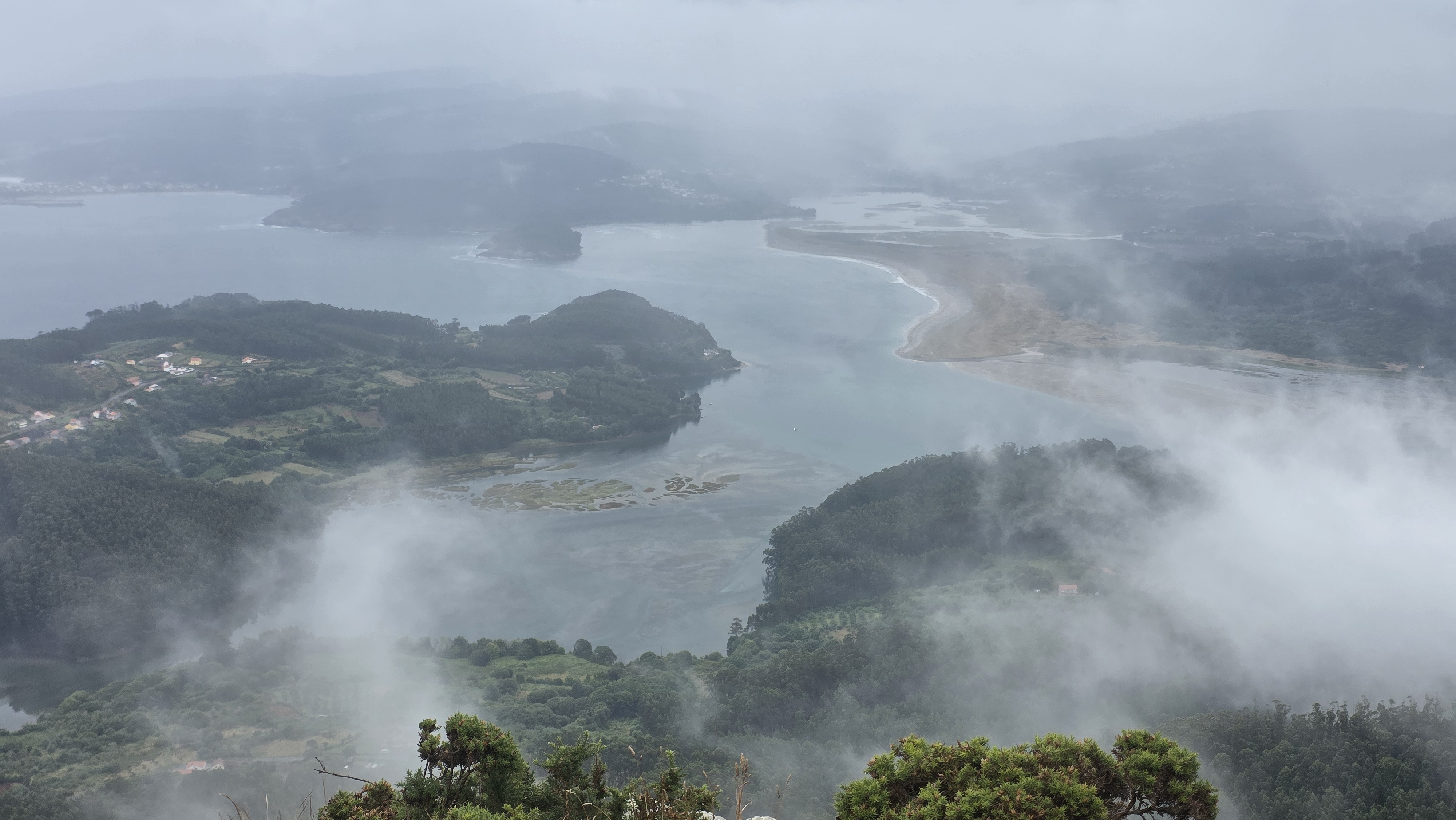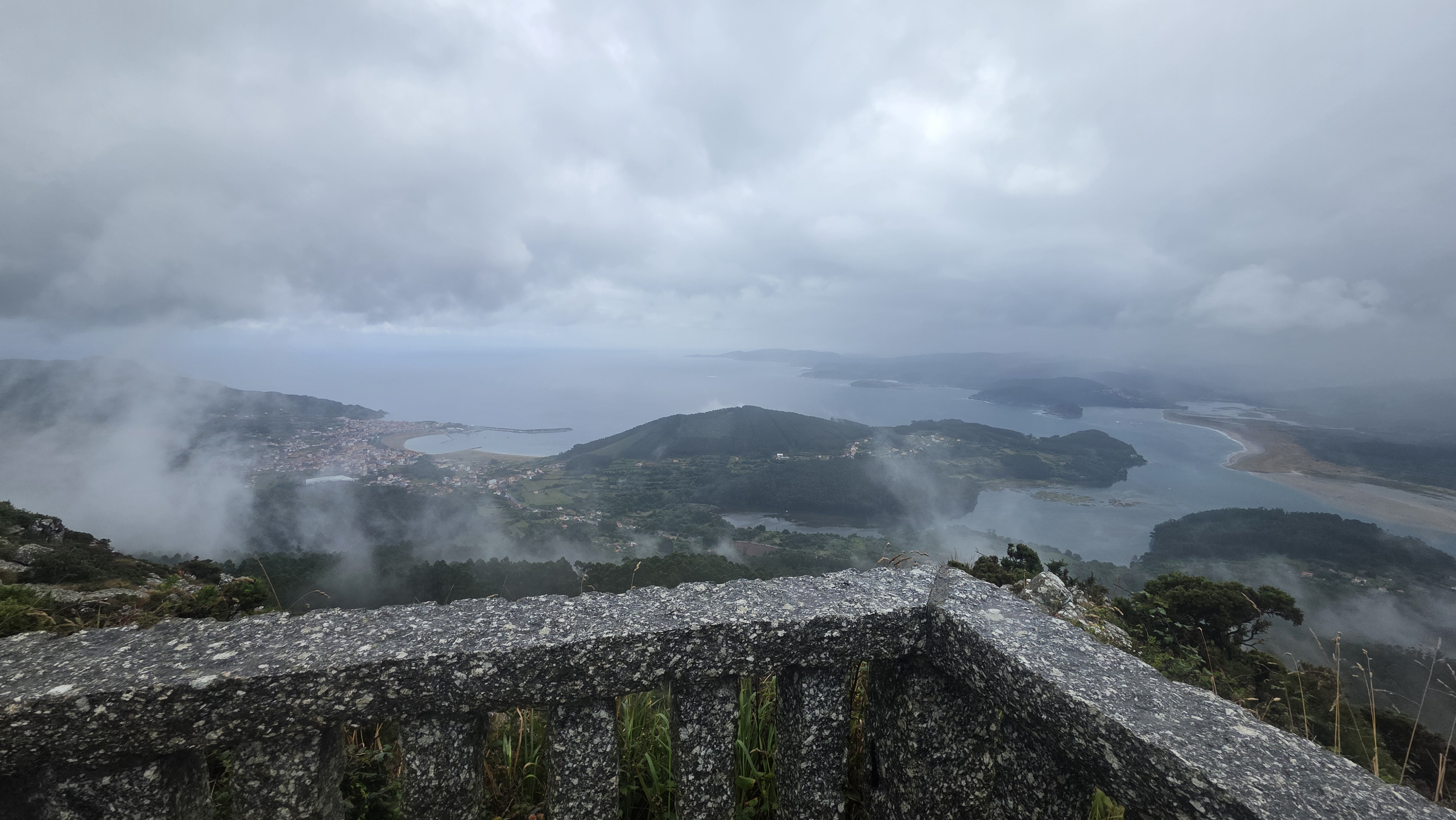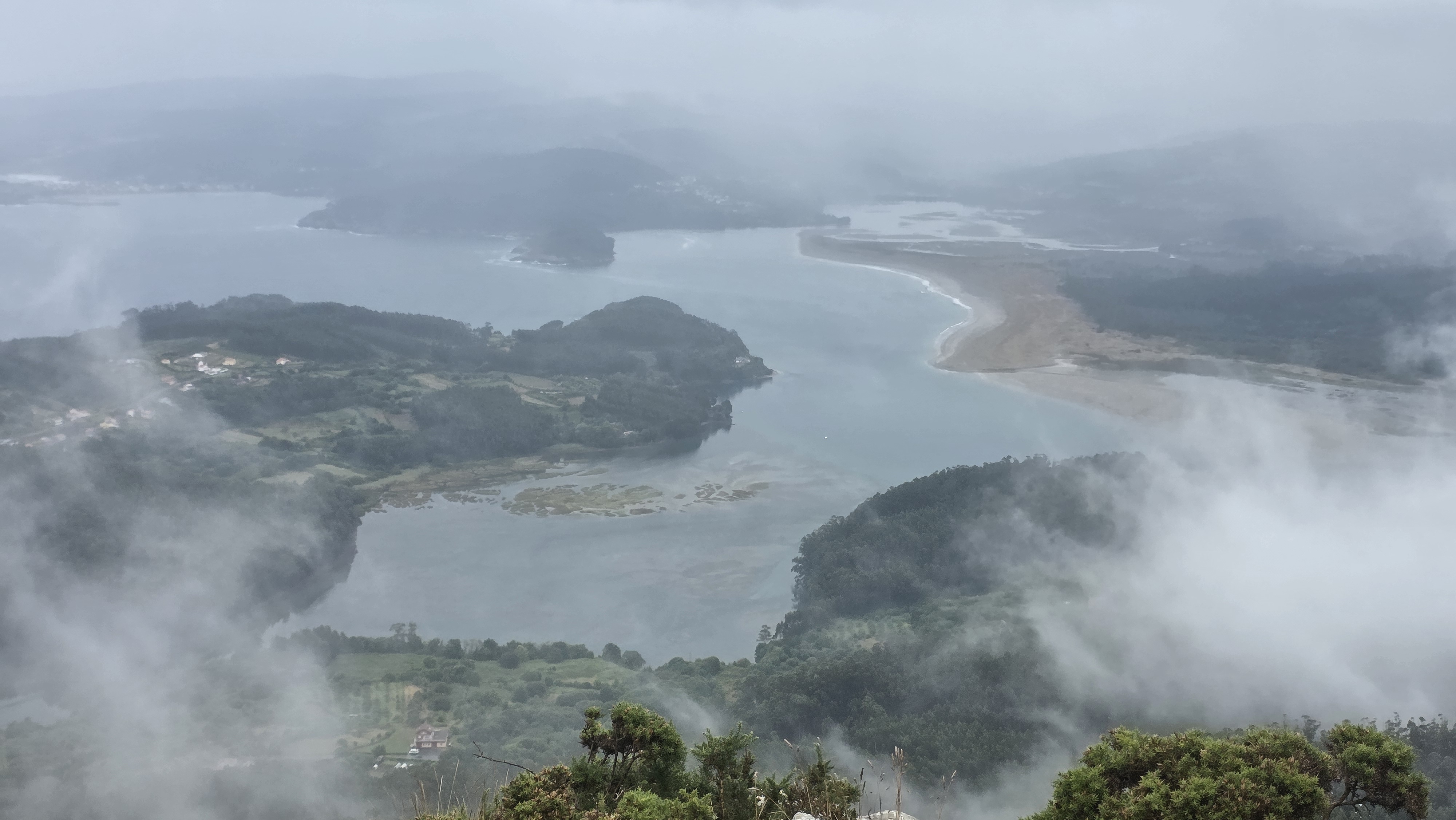 Nous sommes partis sous la pluie et le ciel était encore bien couvert quand nous sommes arrivés à A Miranda. La vue à travers les nuages était vraiment spectaculaire. Ce point de vue est l’endroit idéal pour voir Cariño et la ria que nous avons contournée hier.