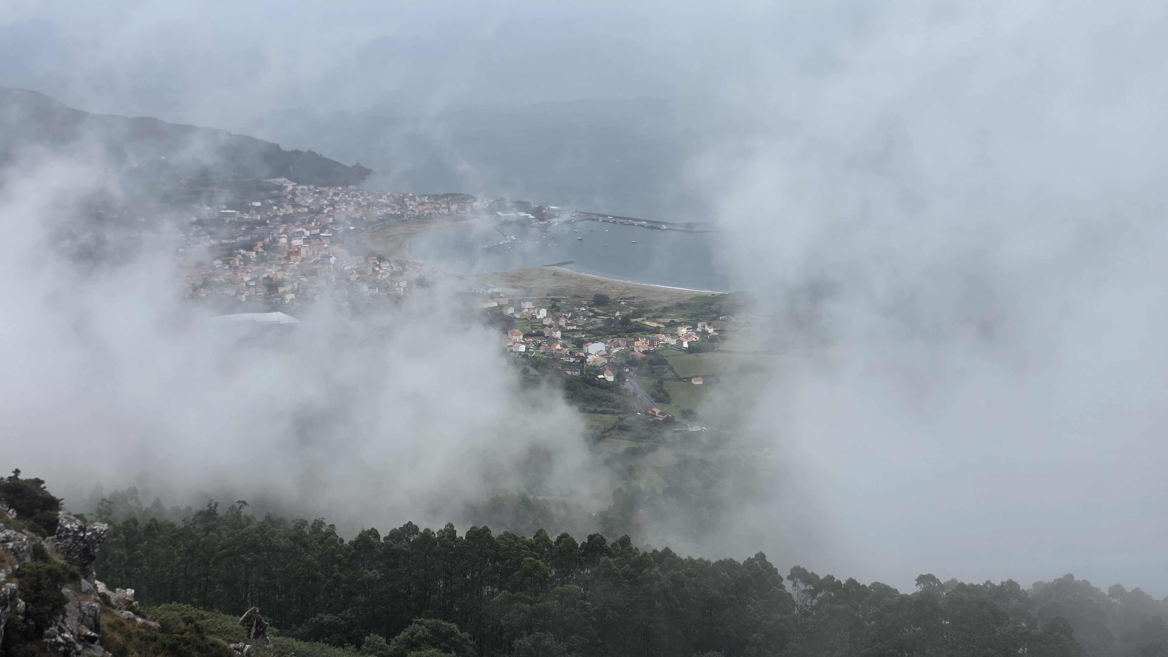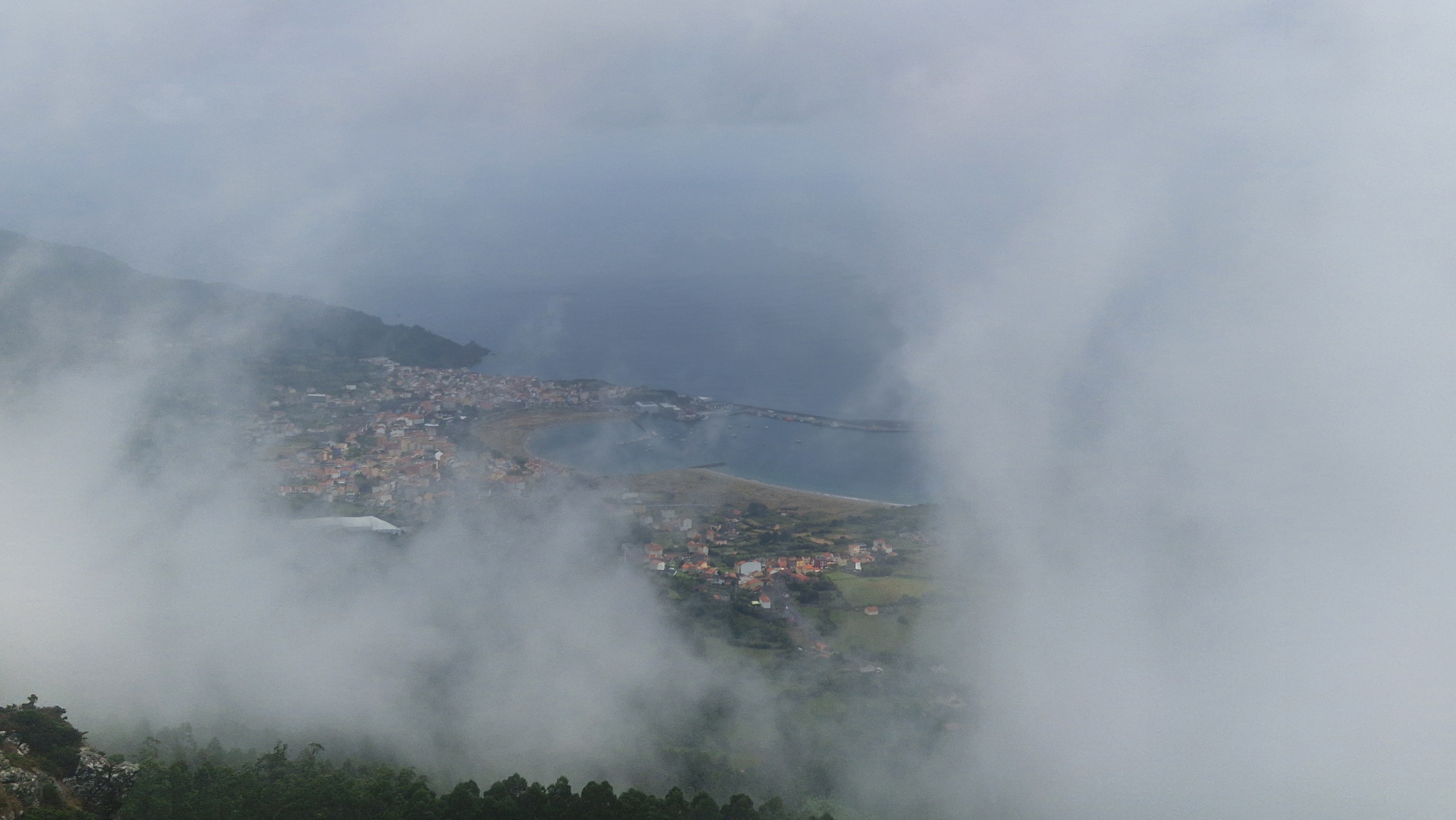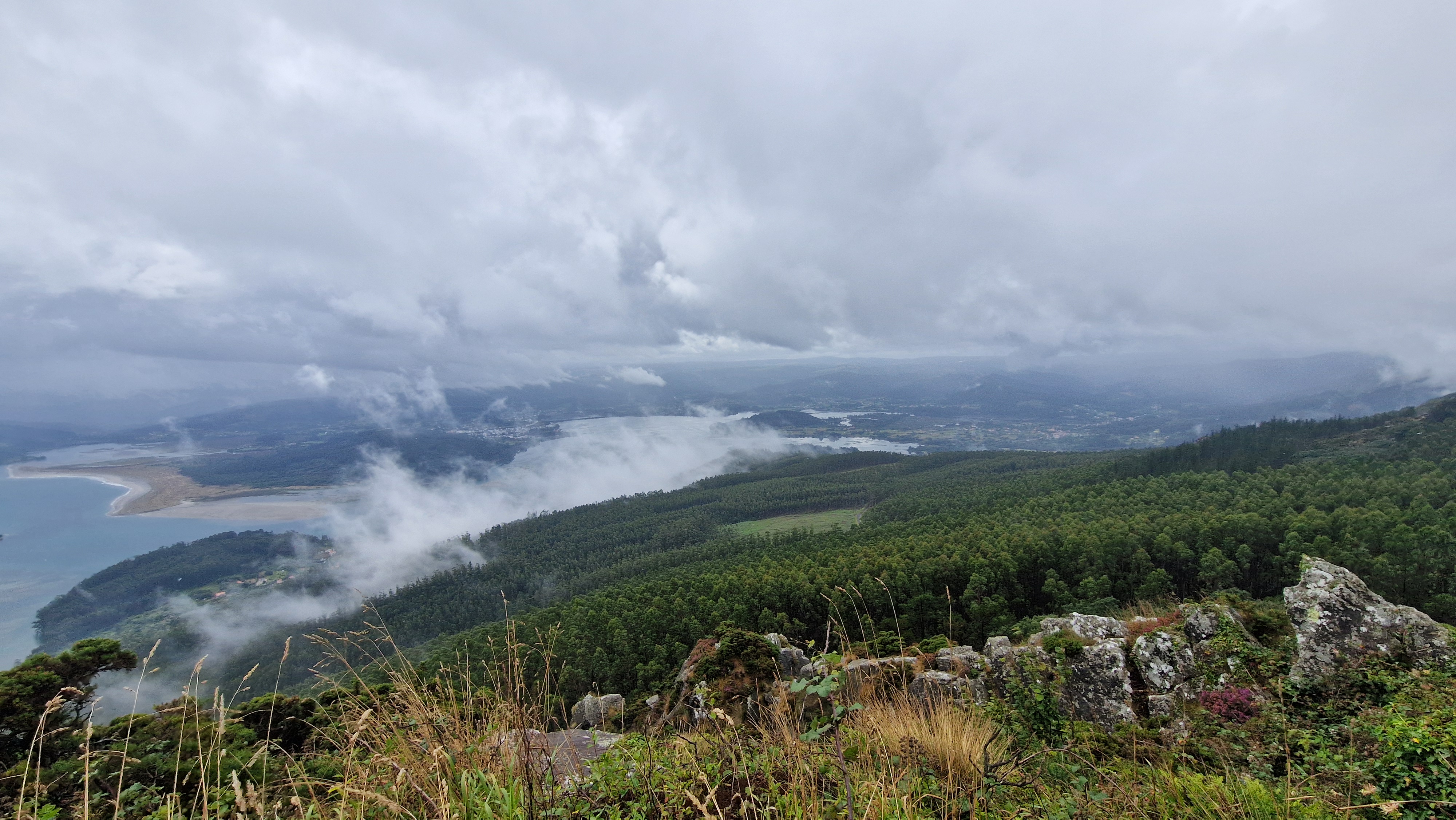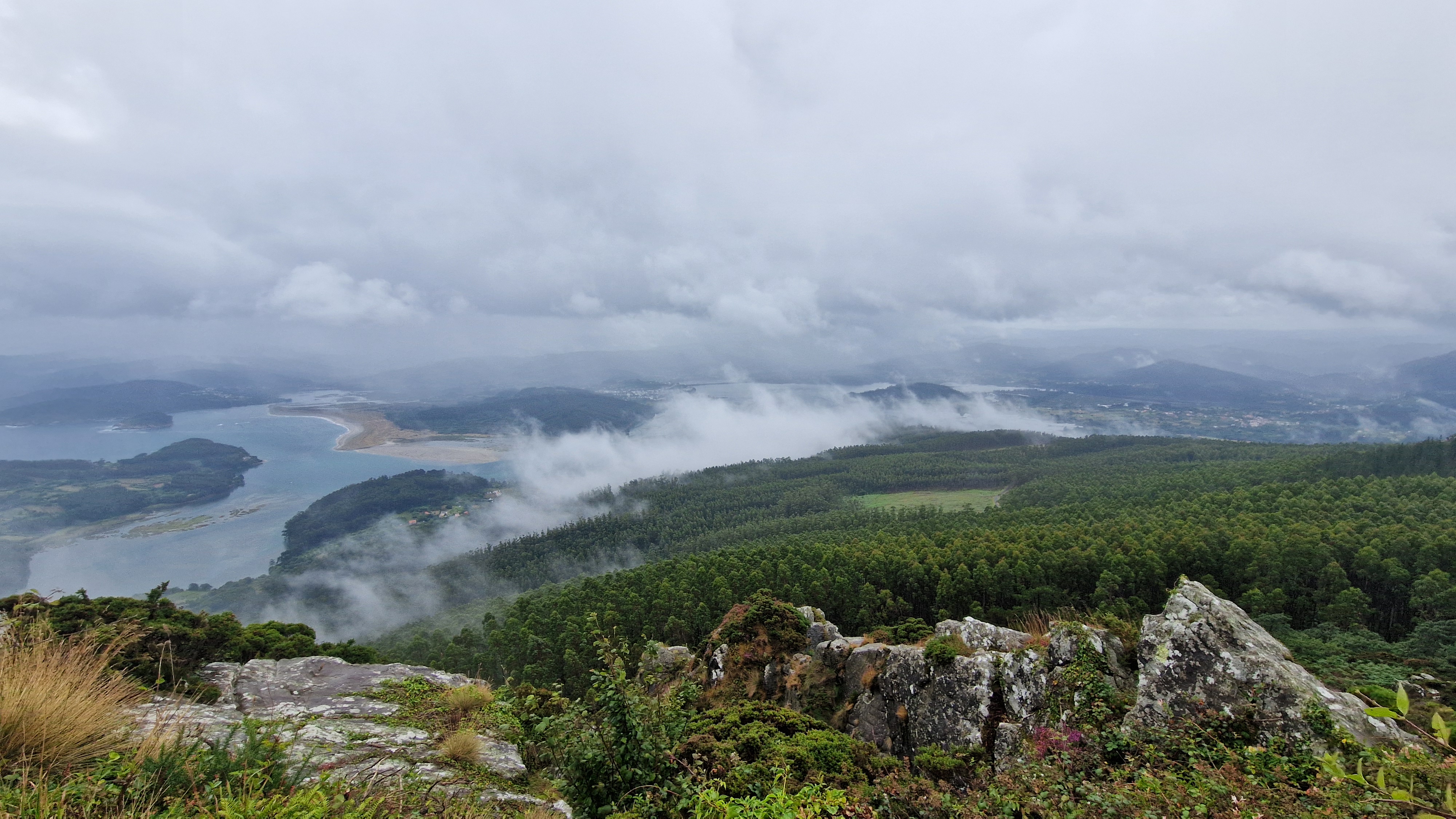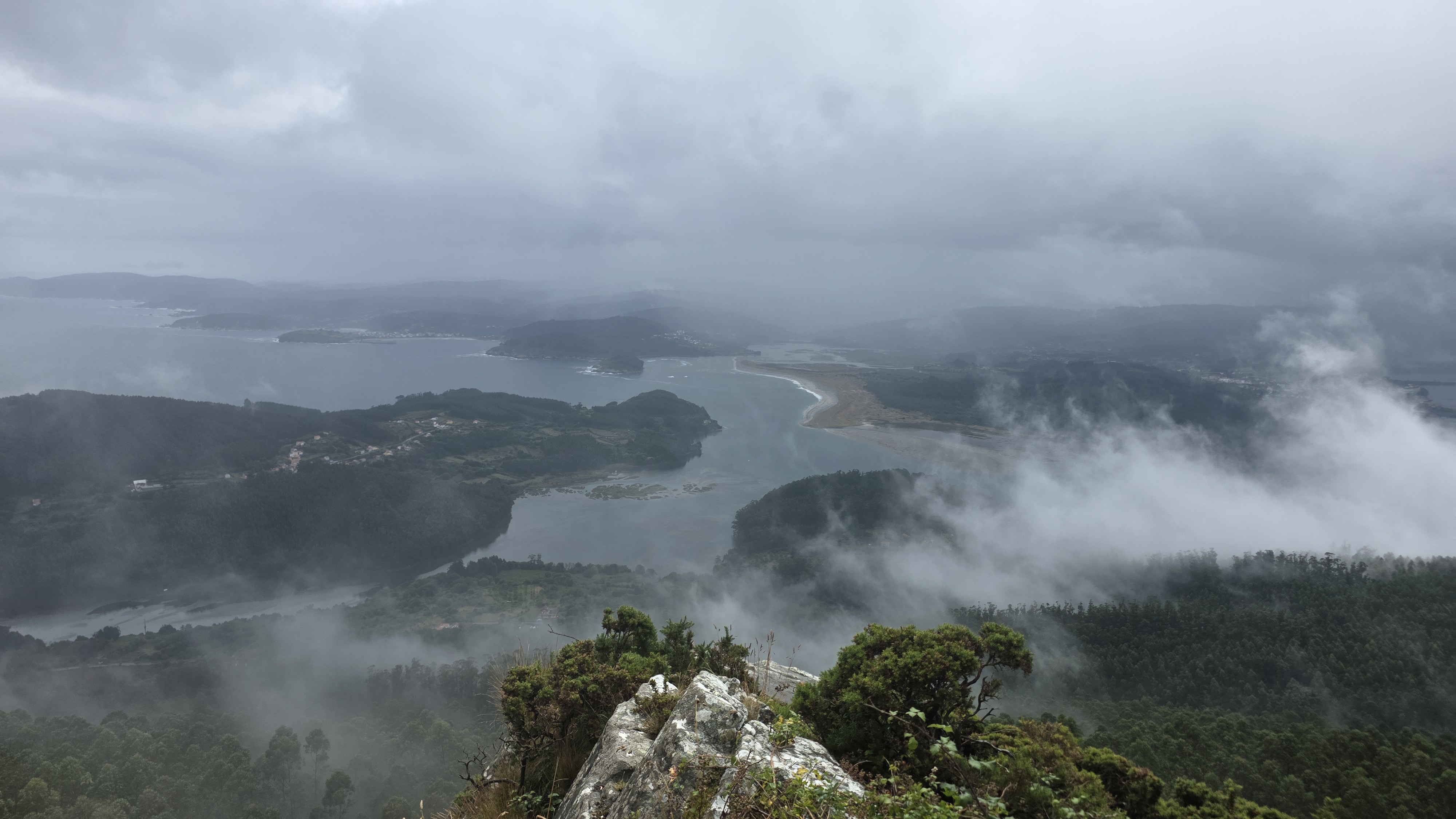 Nous sommes partis sous la pluie et le ciel était encore bien couvert quand nous sommes arrivés à A Miranda. La vue à travers les nuages était vraiment spectaculaire. Ce point de vue est l’endroit idéal pour voir Cariño et la ria que nous avons contournée hier.