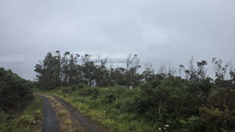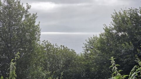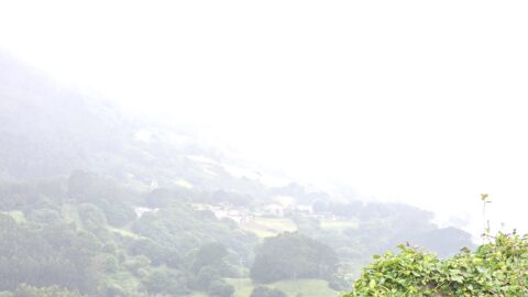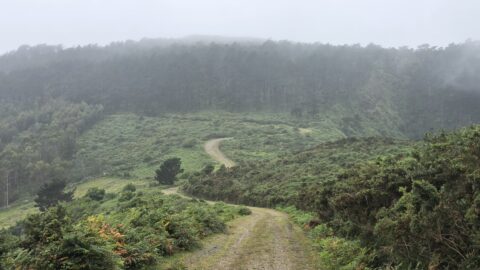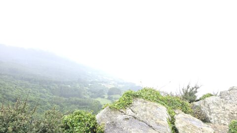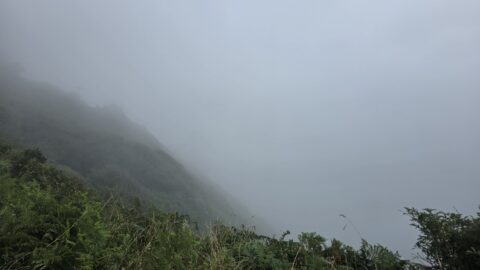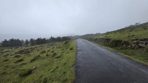 La situation a empiré quand nous avons rejoint la « route des belvédères ». Nous étions arrivés dans le nuage, la route est étroite et il y avait quelques voitures que nous ne voyions qu’au dernier moment à travers nos lunettes mouillées et entendions à peine avec le bruit que faisait le vent (qui s’était levé) dans nos ponchos.