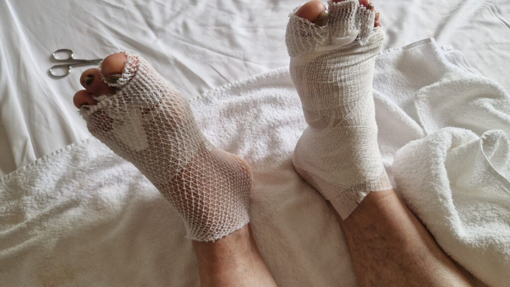 A Ribadeo, nous avons essayé de soigner une légère infection sur mes pieds par des huiles essentielles diluées, cela a provoqué une allergie spectaculaire et quand nous sommes arrivés à Foz je ne pouvais plus enfiler mes chaussures.
